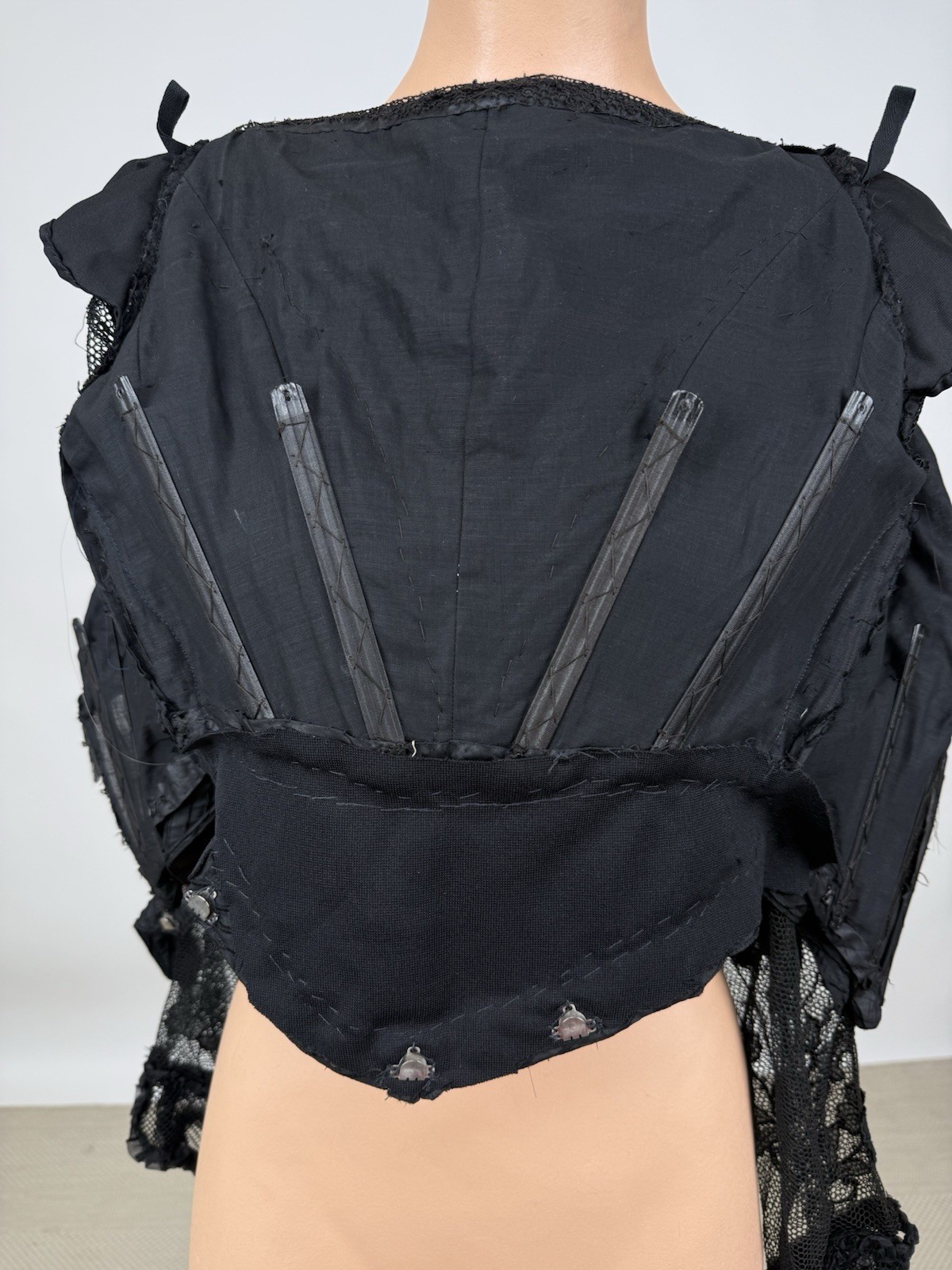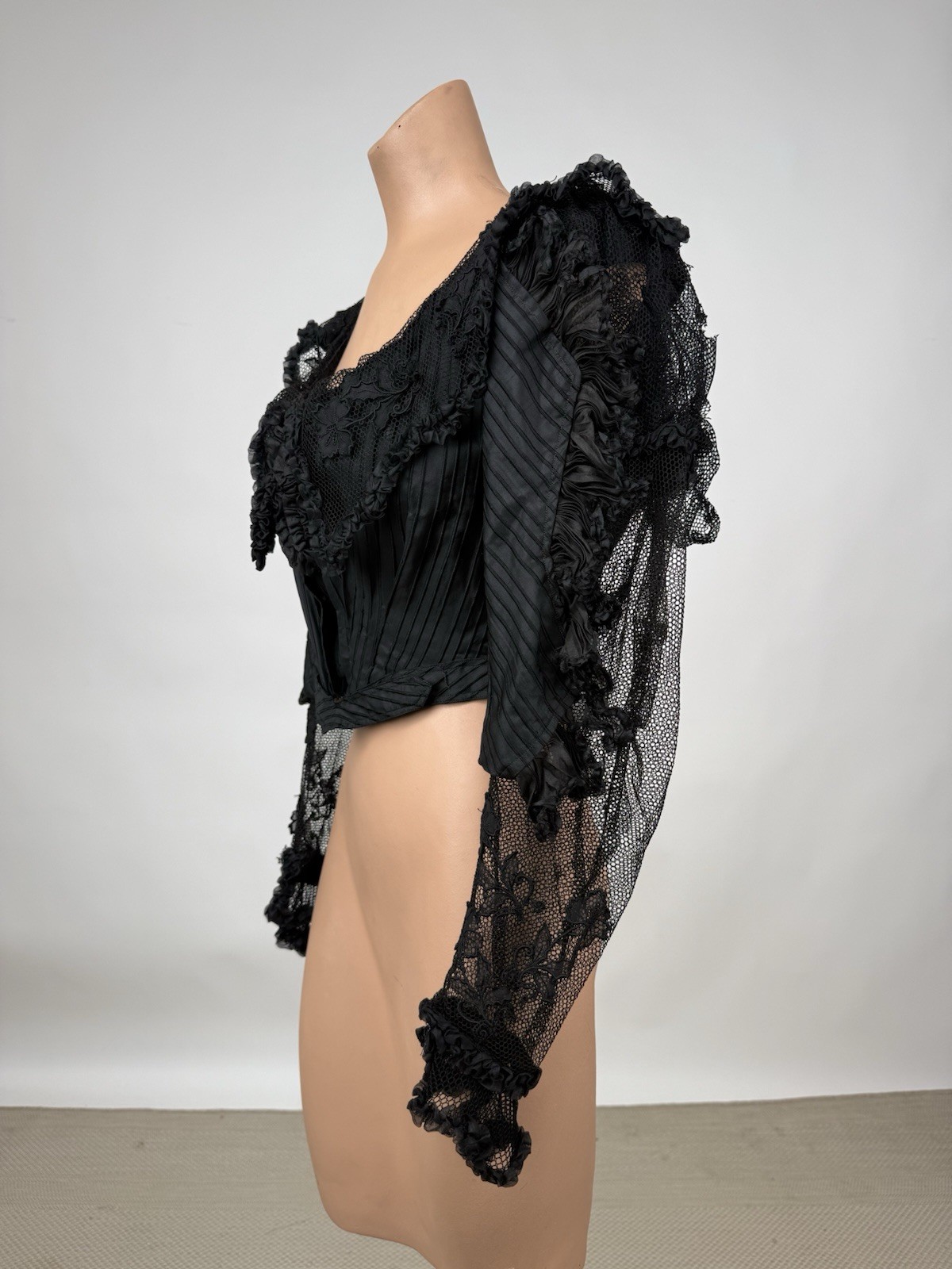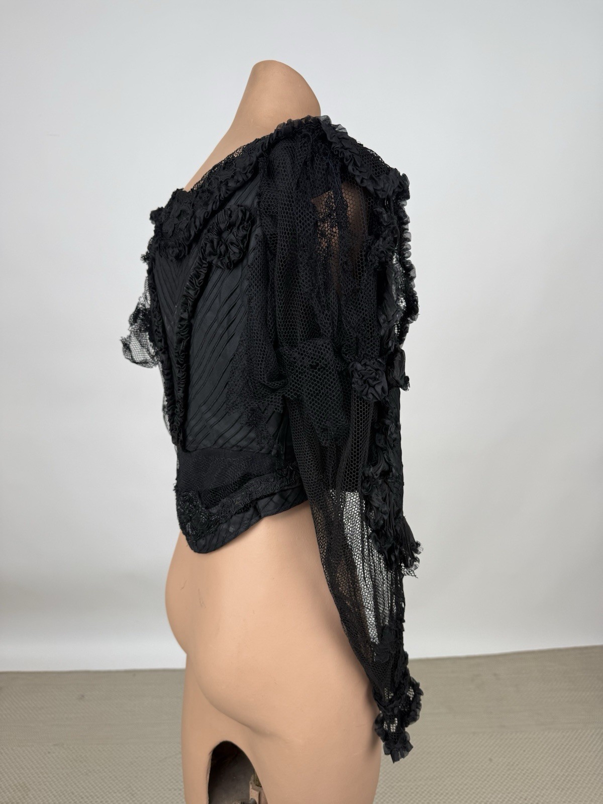 Antique Victorian 1890s Black Silk Net Lace Blouse Floral Applique Embroidery