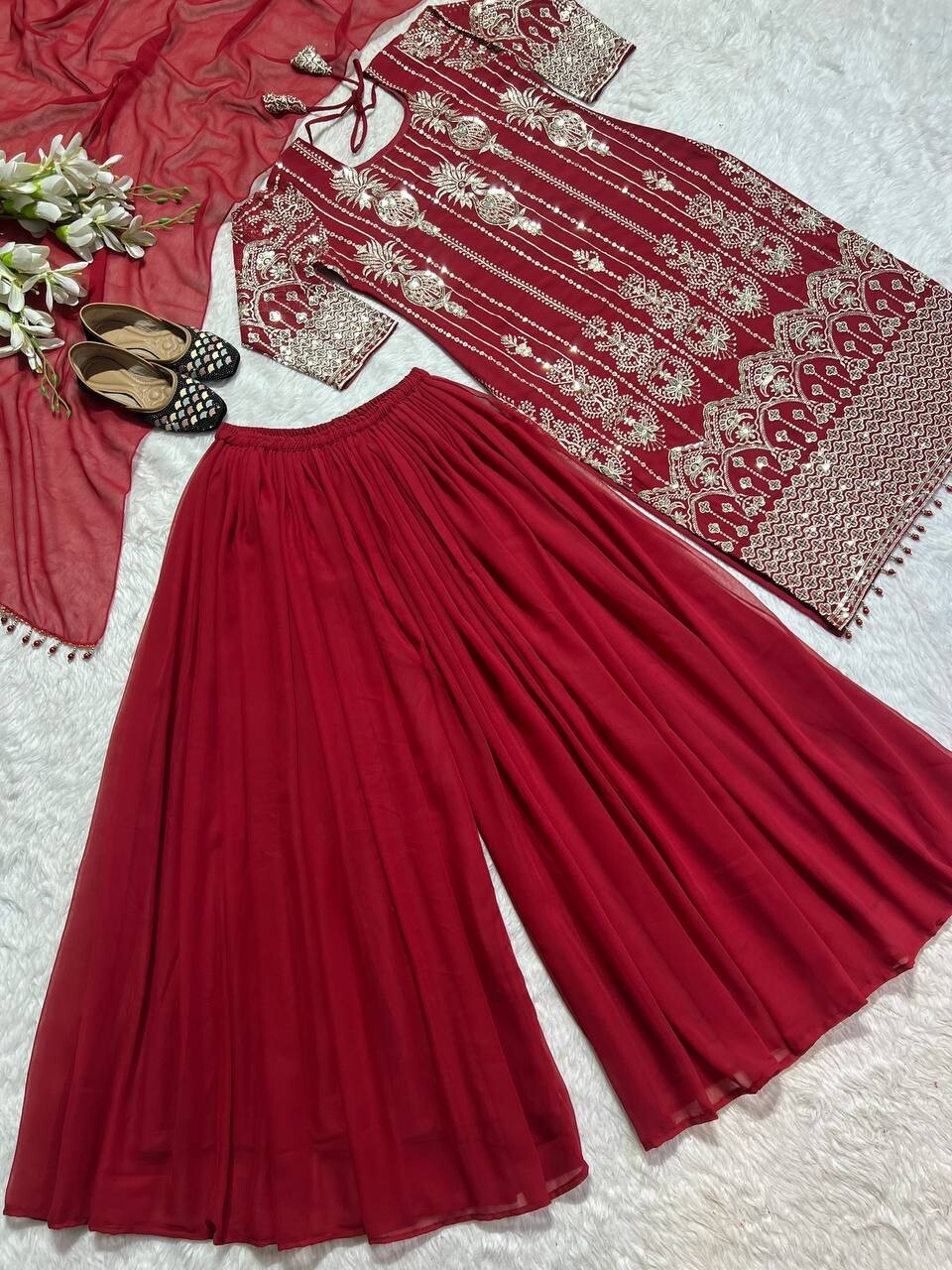 Traditional Look Faux Georgette Top Palazzo And Dupatta For Women And Girls