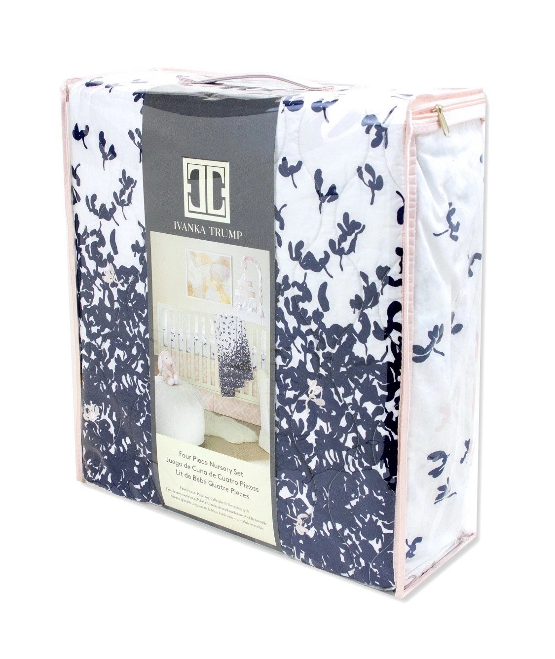 Ivanka Trump 4pc Nursery BABY Crib Bedding Set Pink/White/Navy Plush Bunny NEW