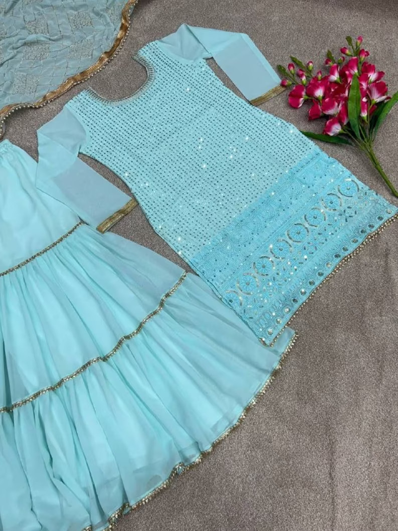 Presenting Faux Georgette Top Palazzo And Sky Blue Dupatta For Wedding Wear