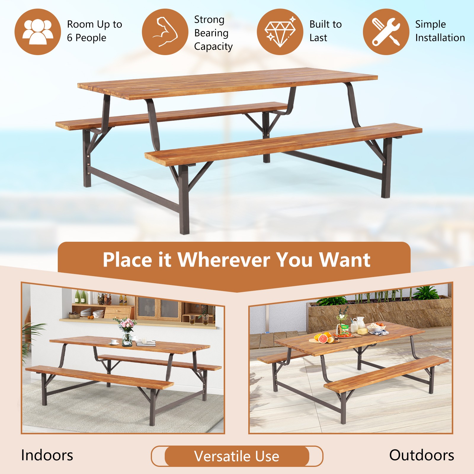 как выглядит Acacia Wood Patio Picnic Table Bench Set w/ 71" Tabletop  2" Umbrella Hole фото