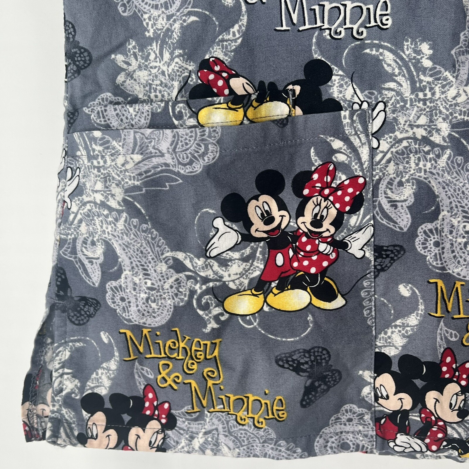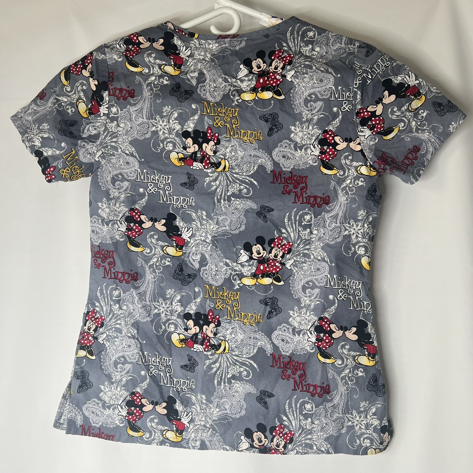 как выглядит Disney Kissing Mickey Minnie Womens XS Gray Scrub Top Short Sleeve Pockets фото