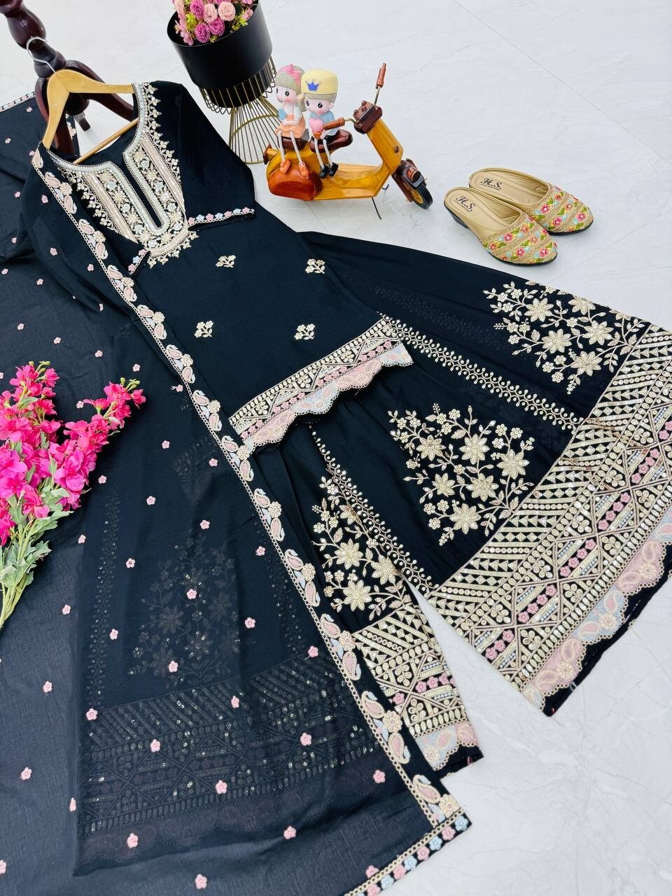 как выглядит Stunning Black Heavy Chinnon Silk Top Palazzo With Dupatta For Women Wear фото