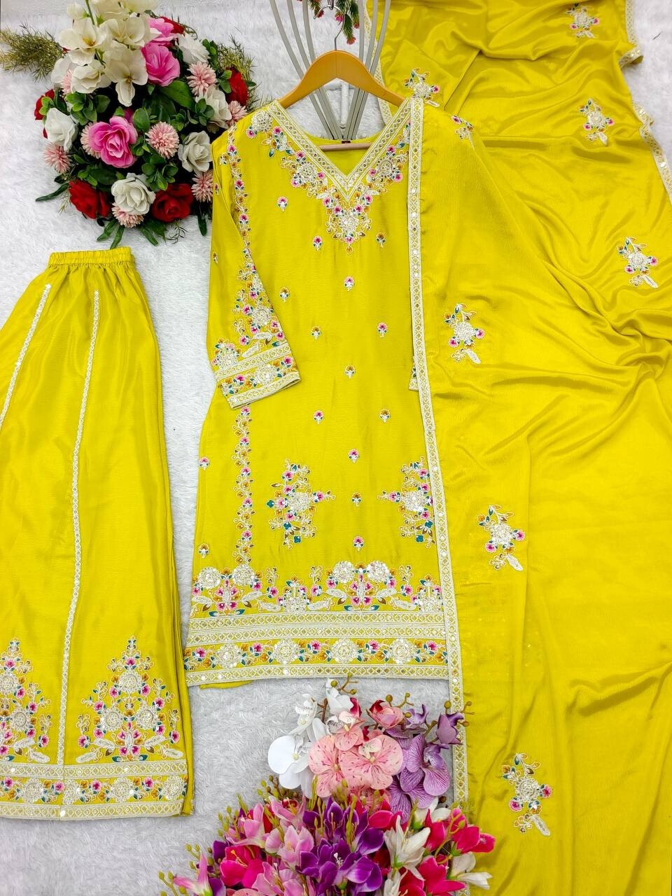 Fancy Look Yellow Chinnon Silk Top Palazzo With Dupatta For Women Festival
