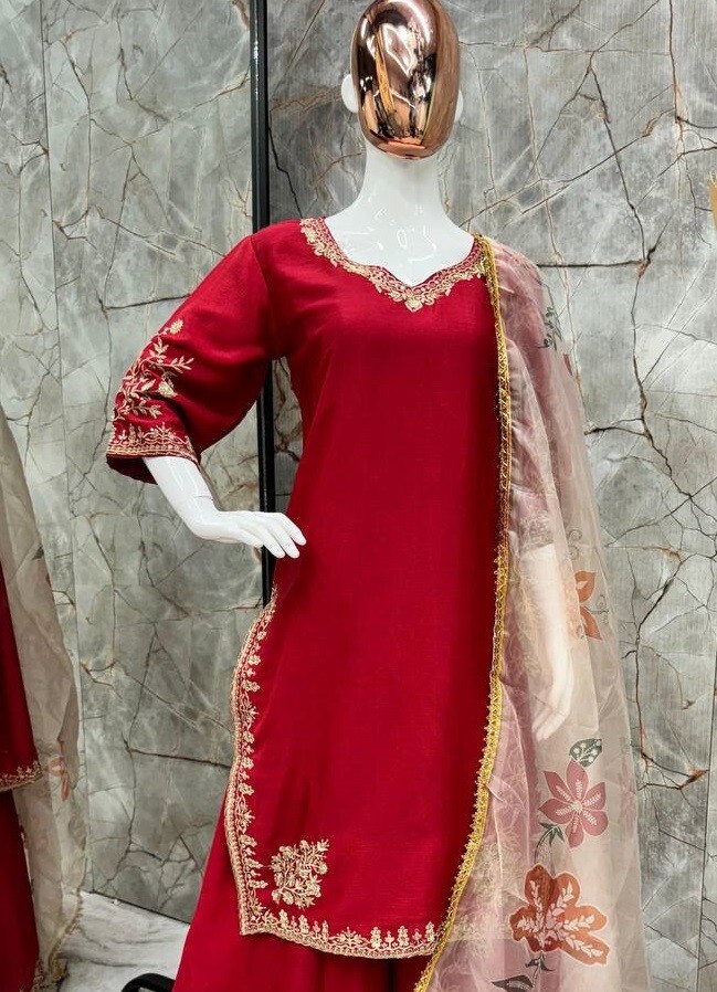 Wedding Wear Red Chinnon Silk Top And Palazzo With Organza Dupatta For Women