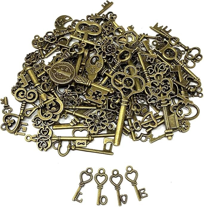 70 PCS Vintage Skeleton Key Set Charms, Mixed Antique Style Bronze Brass for