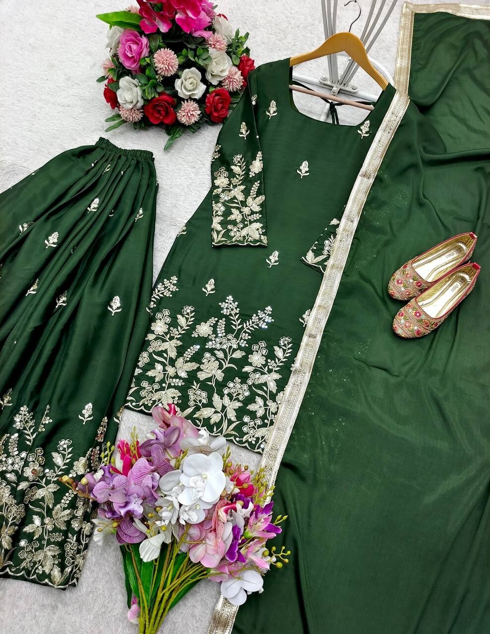 Bollywood Style Pure Chinon Silk Top Palazzo And Green Dupatta For Festival Wear