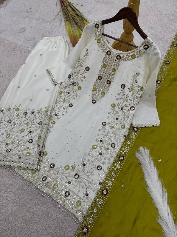 как выглядит Ethnic Look Pure Chinnon White Top Palazzo With Olive Green Dupatta For Wedding фото