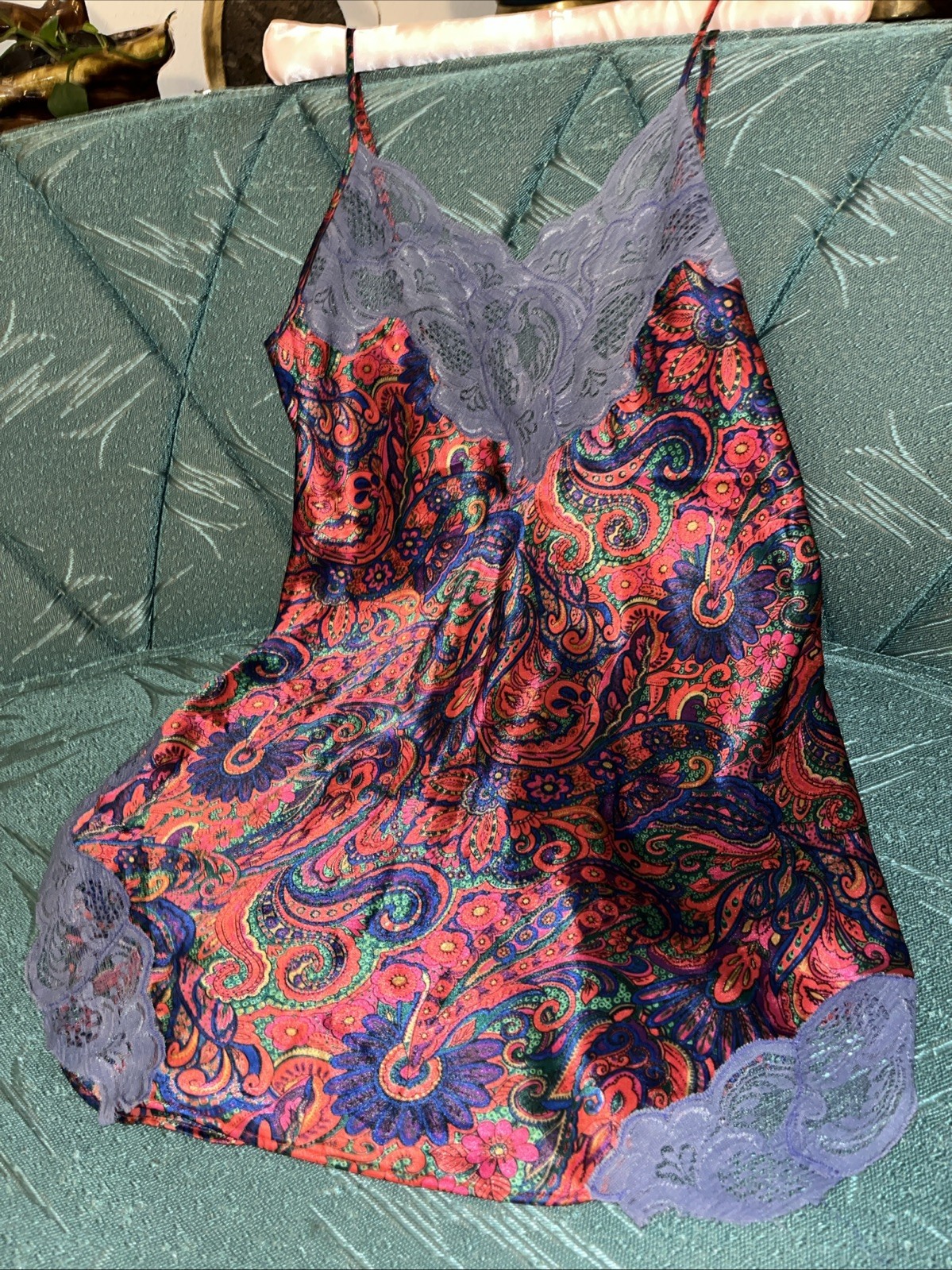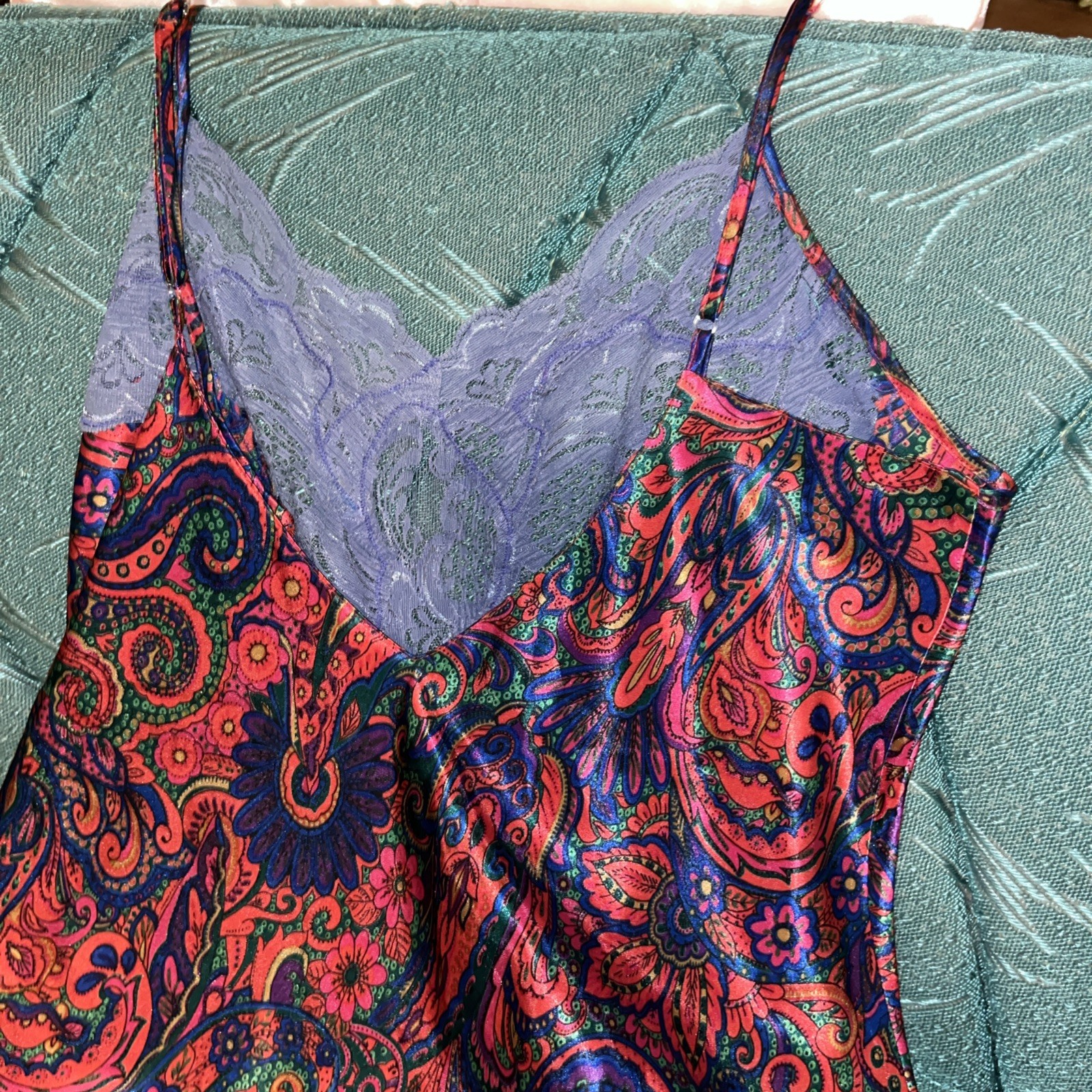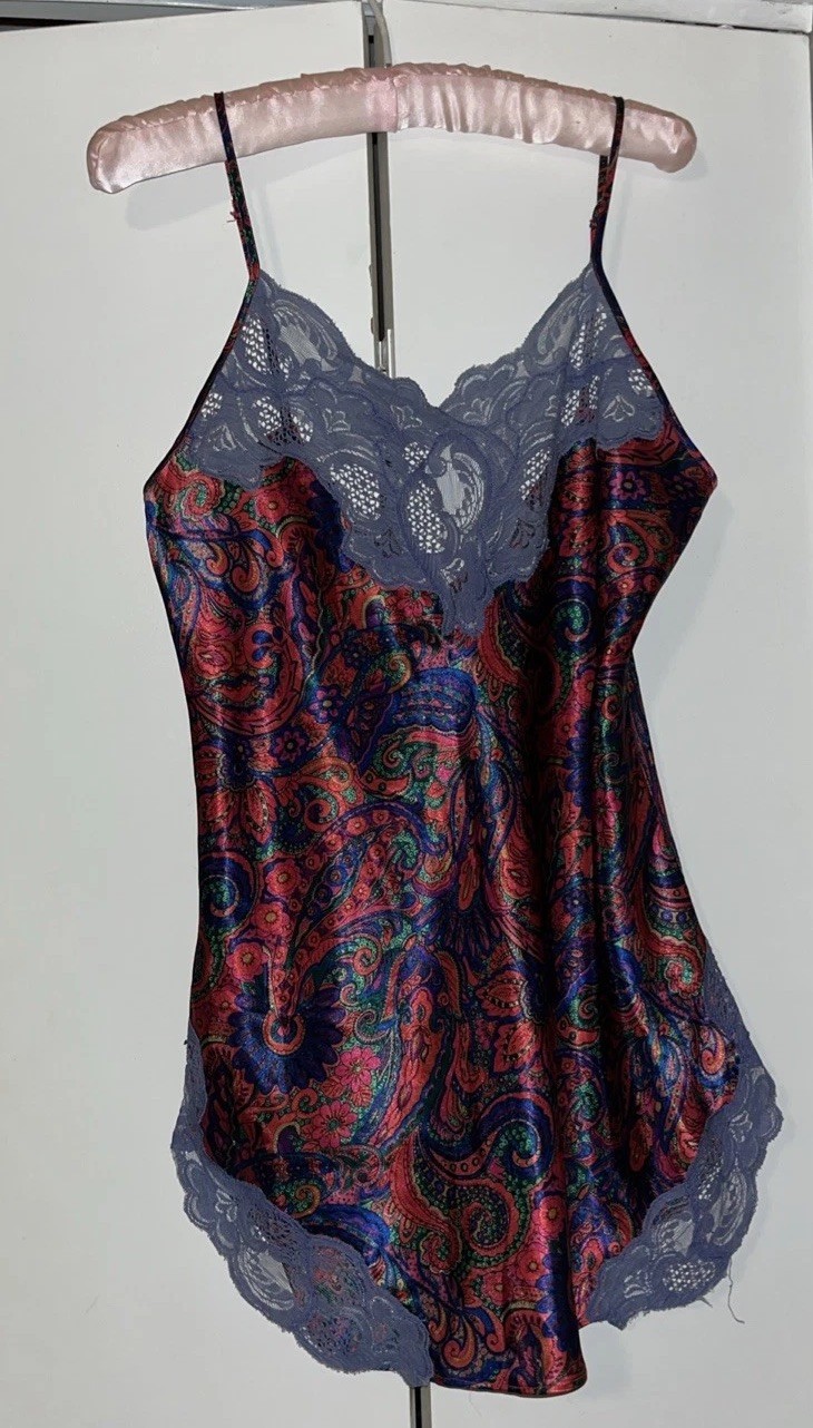 как выглядит Vintage Victoria s Secret Gold Label Floral Paisley Slip Chemise Small Lace Trim фото