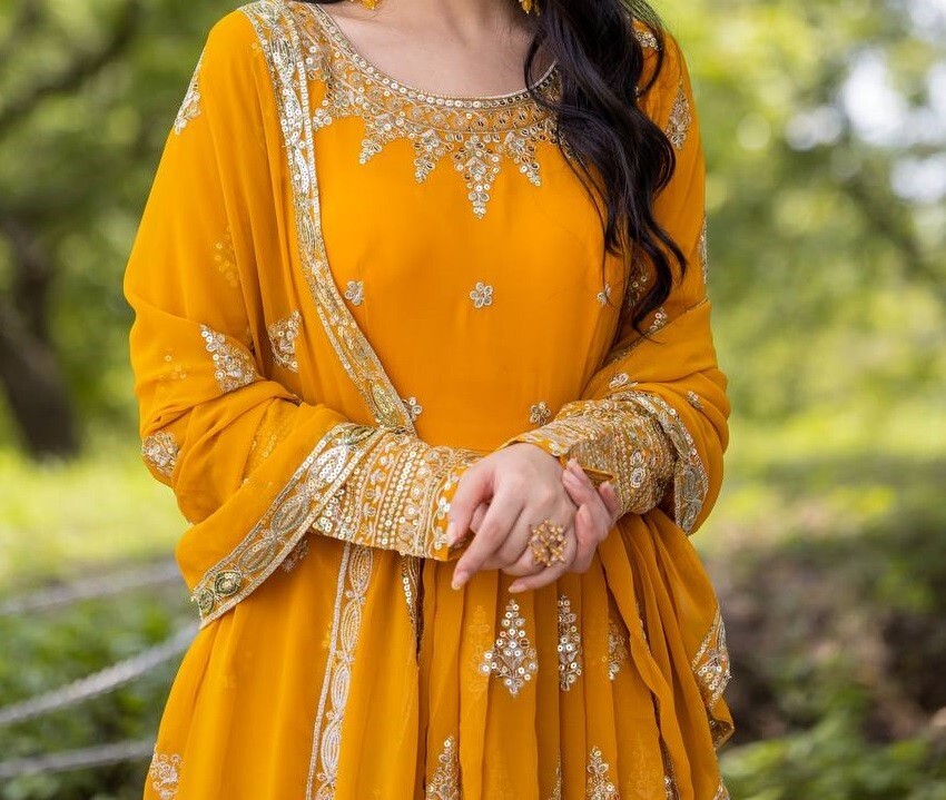 как выглядит New Presenting Heavy Faux Georgette Yellow Gown Bottom With Dupatta For Women фото