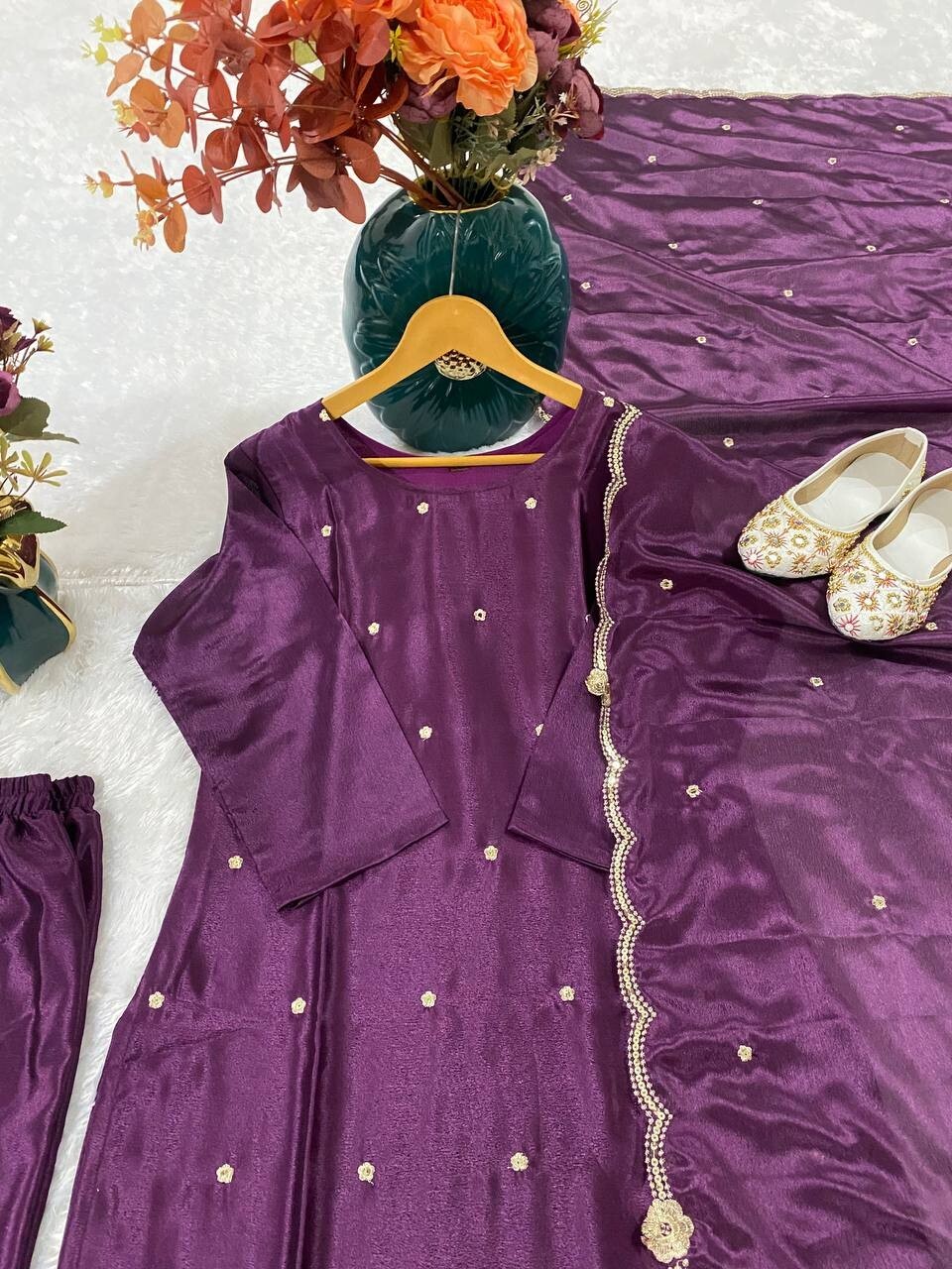Stylish Heavy Pure Chinnon Purple Salwar Kameez With Dupatta For Women Girls