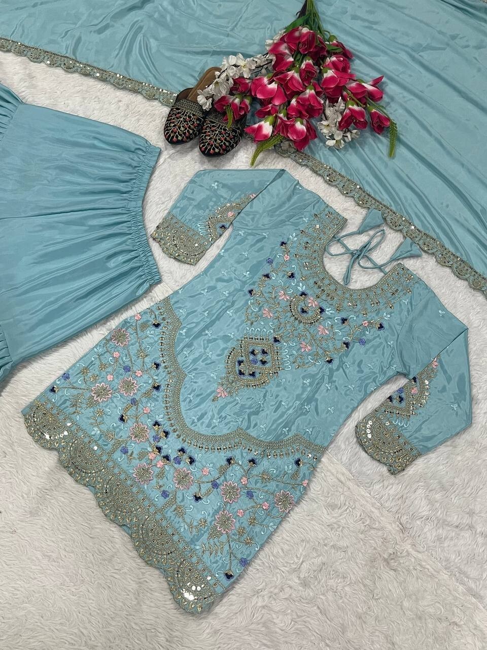 Fancy Collection Sky Blue Natural Crepe Kurta Palazzo With Dupatta For Women