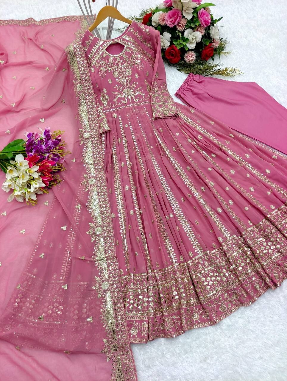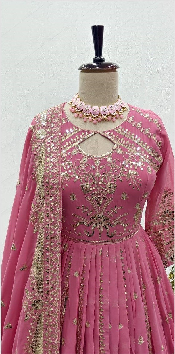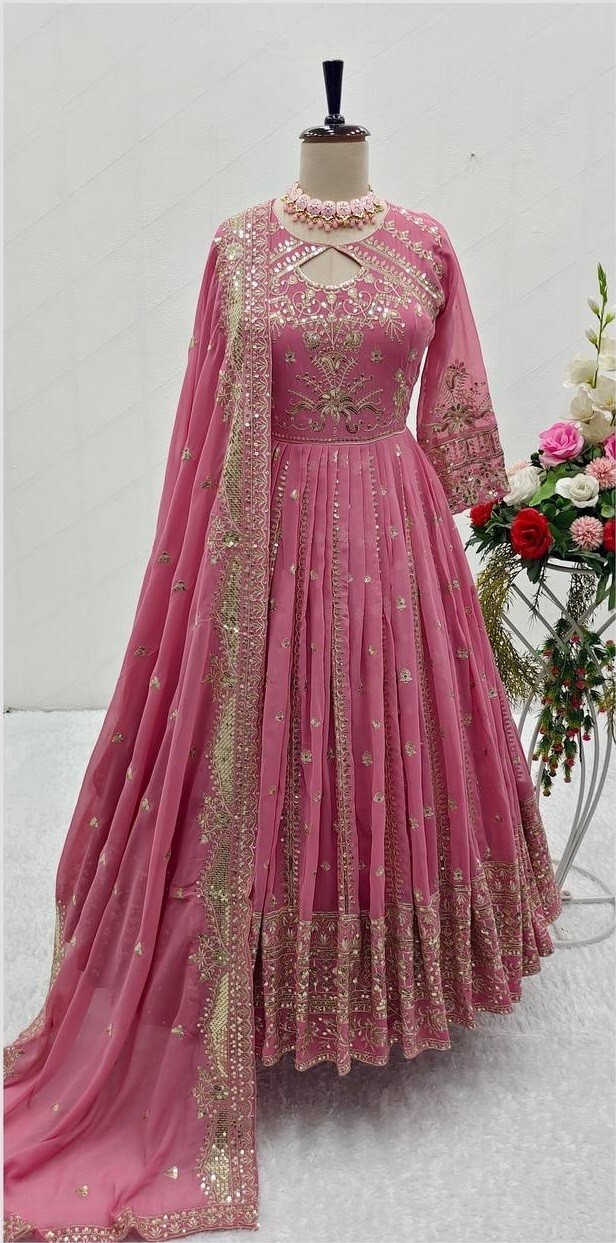 как выглядит Stylish Heavy Faux Georgette Pink Gown Bottom With Dupatta For Reception Wear фото