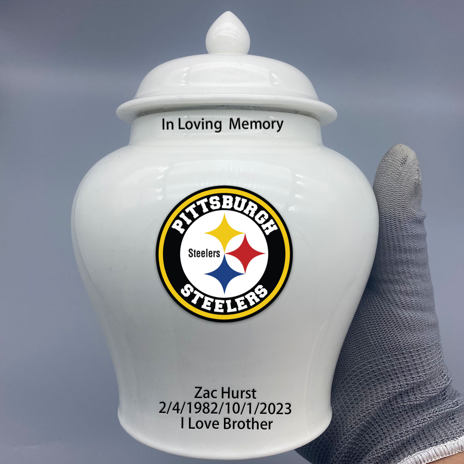 Ceramic Football Urn Pittsburgh Steelers Theme, Custom Text Number