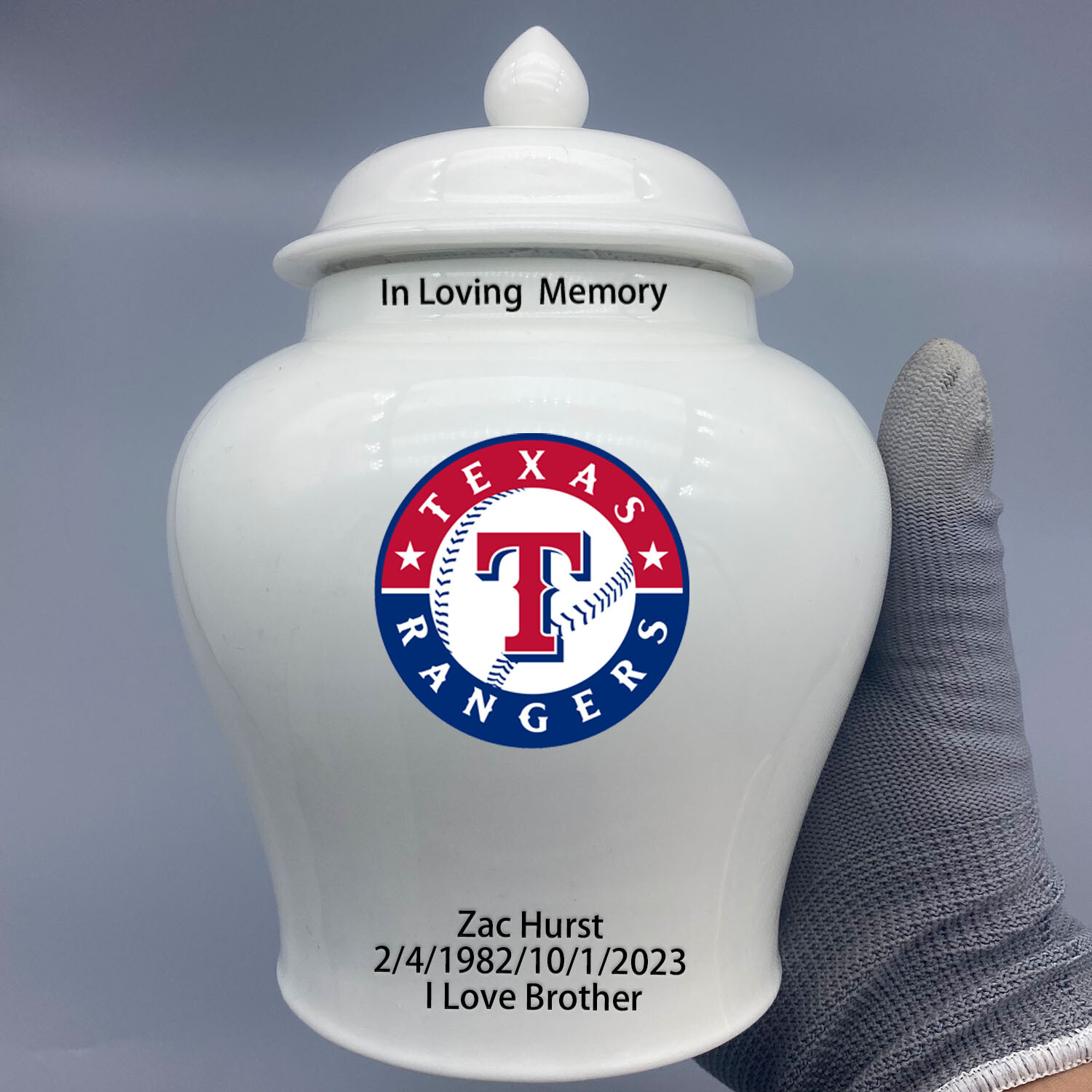 Ceramic Baseball Urn Texas Rangers Theme, Custom Text Number
