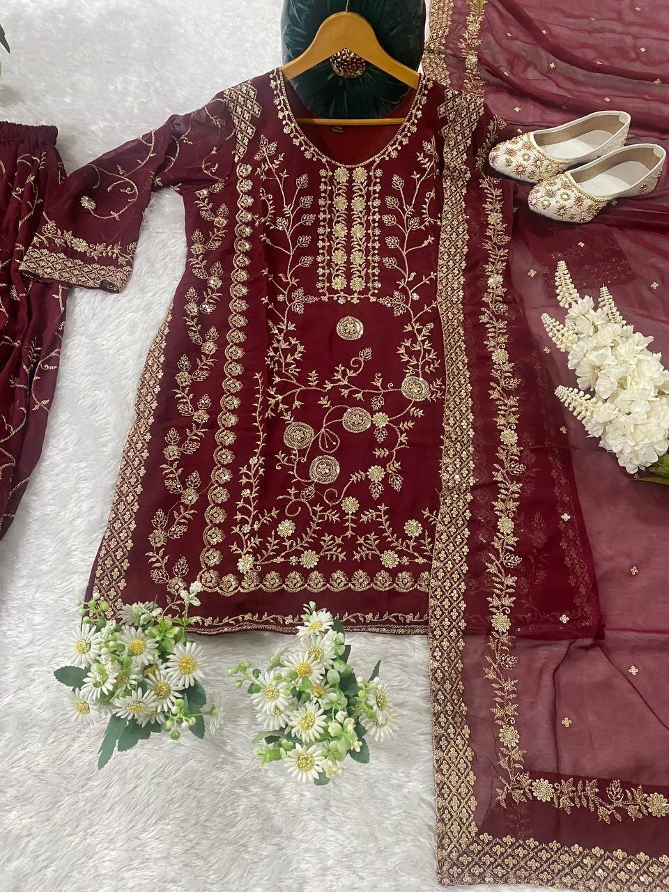 New Fancy Maroon Heavy Georgette Top Palazzo With Dupatta For Party Wear