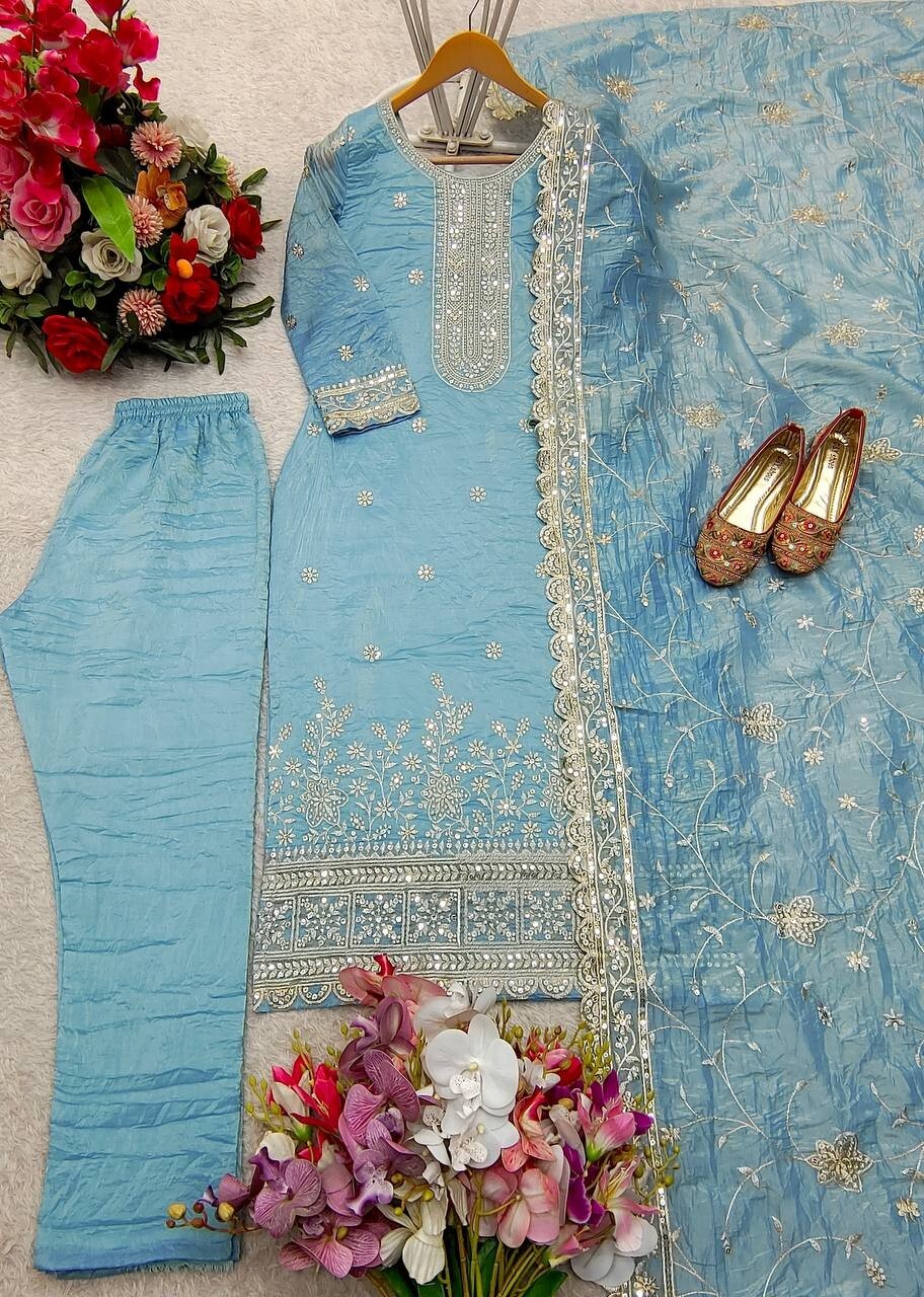 как выглядит Stunning Pure Gold Crush Silk Salwar Kameez With Sky Blue Dupatta For Festival фото
