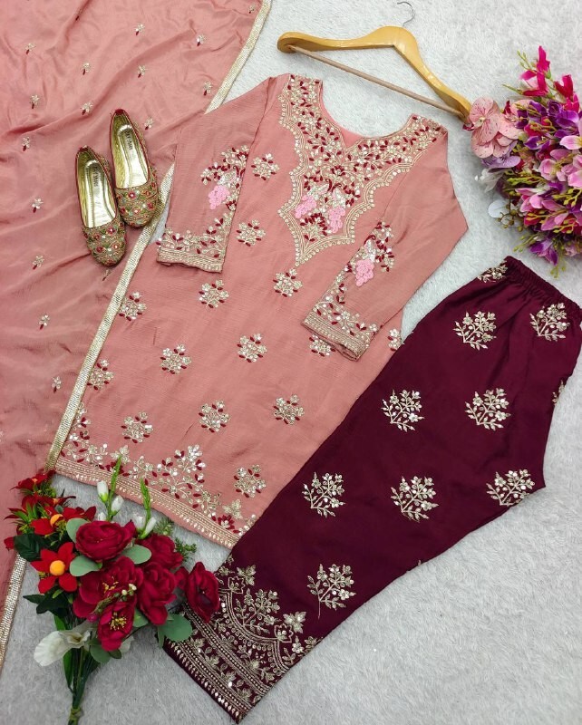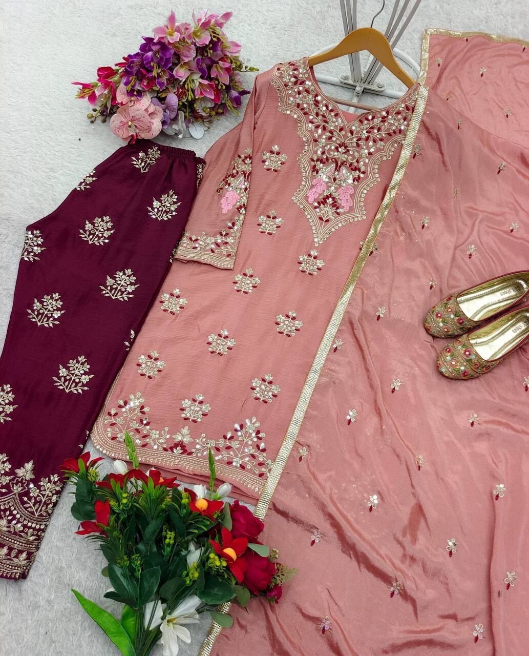 Classy Peach Pure Chinnon Silk Salwar Kameez With Dupatta For Women Girls