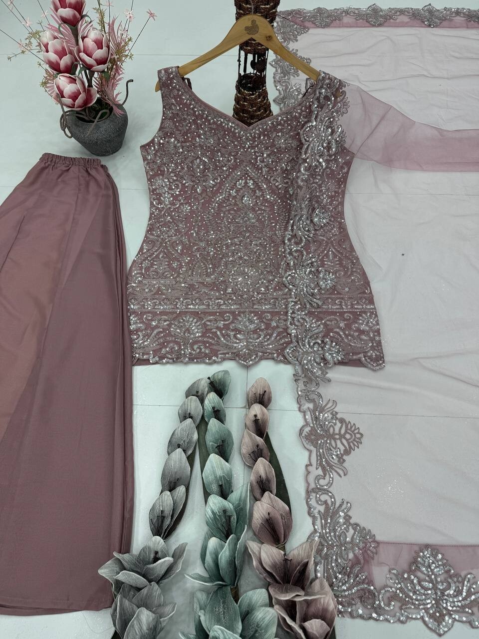 как выглядит Bollywood Style Star Georgette Top Palazzo And Dusty Pink Dupatta For Women фото