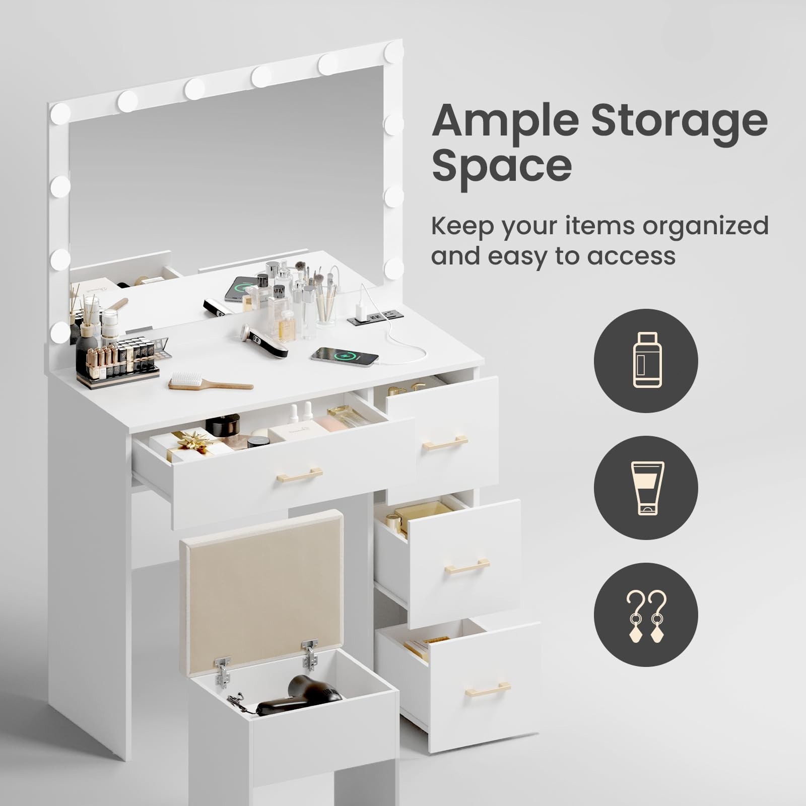 White Vanity Makeup Desk Dressing Table W/ LED Lighted Mirror and Power Outlet