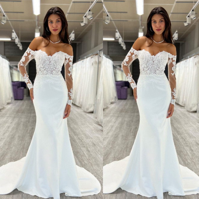 Mermaid Satin Wedding Dresses Off Shoulder Long Sleeve Lace Applique Bridal Gown
