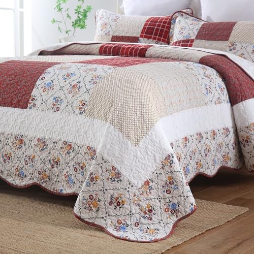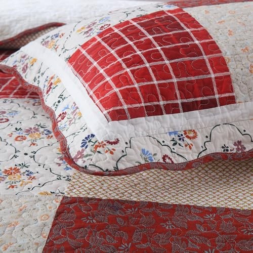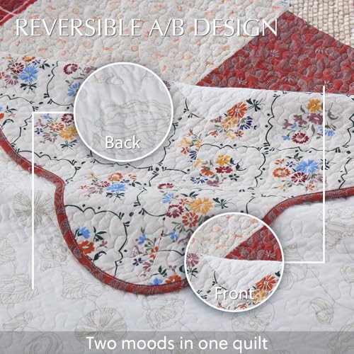 Cotton Bedspread Quilt Bedding Sets 3 Pieces King Size Red White Floral