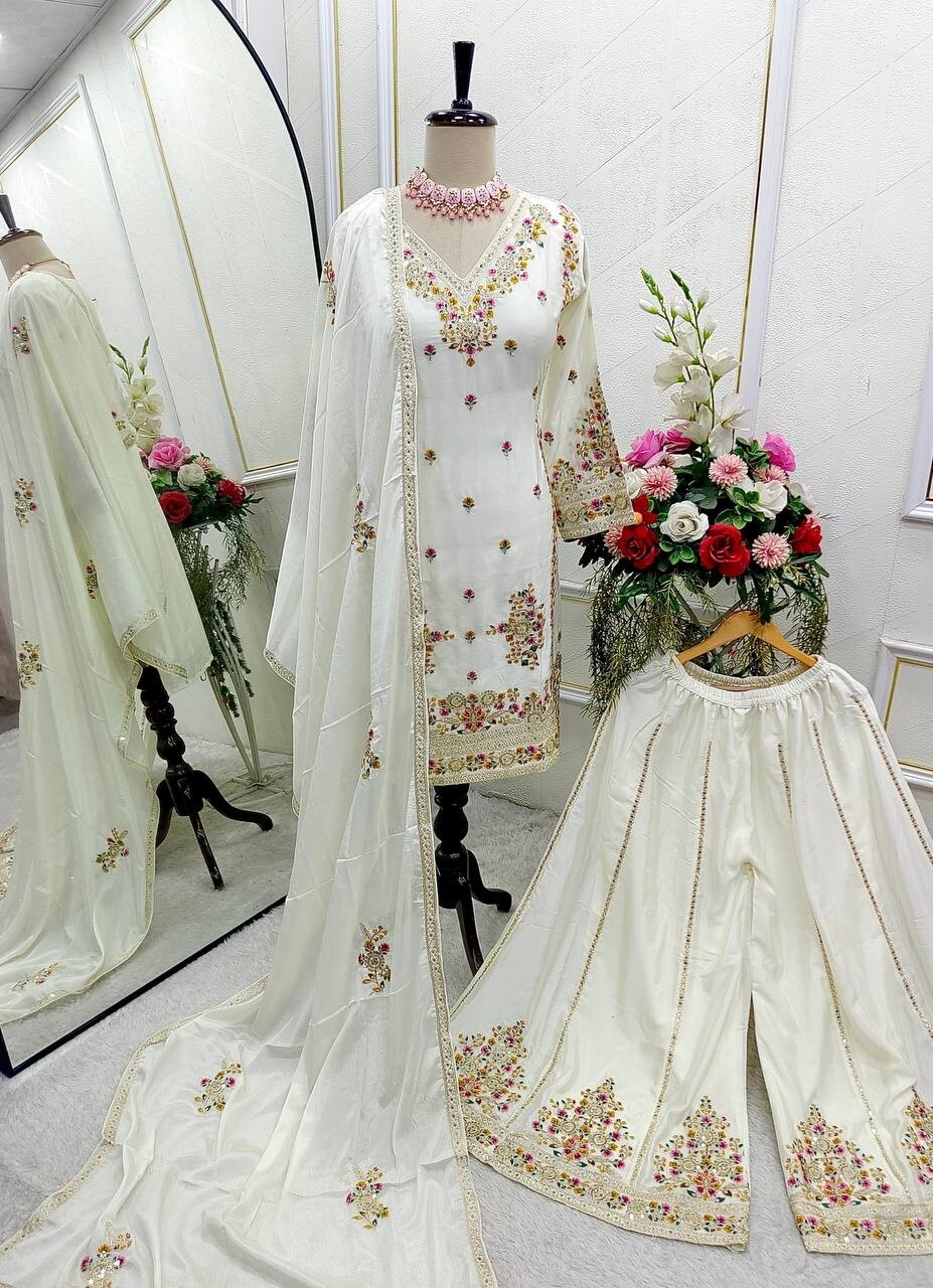 Presenting Pure Chinnon Silk White Palazzo Suit With Dupatta For Women Function