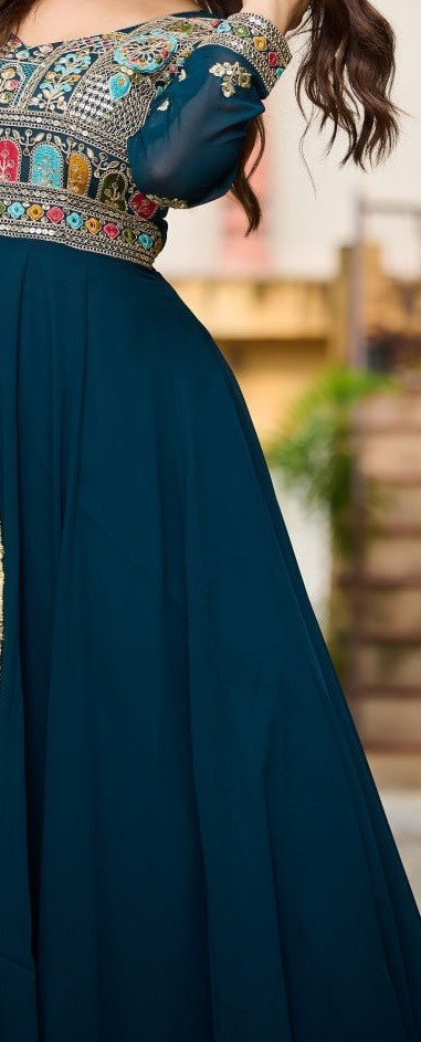 Stunning Look Faux Blooming Gown With Rama Dupatta For Indian Engagement Wear