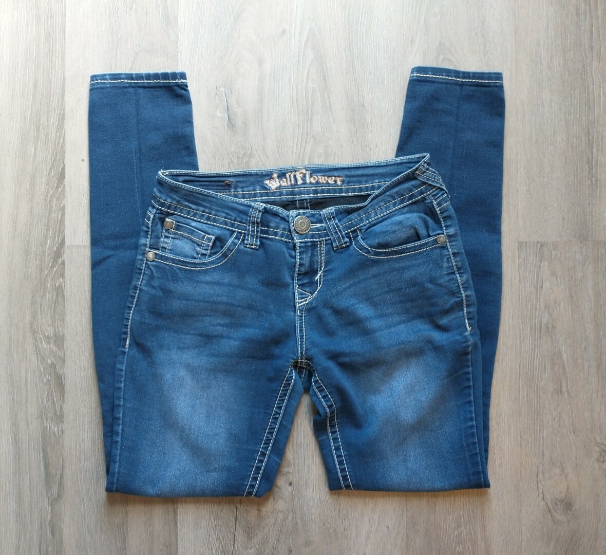 как выглядит Wallflower Skinny Denim Blue Jeans Embroidered Back Pockets Women