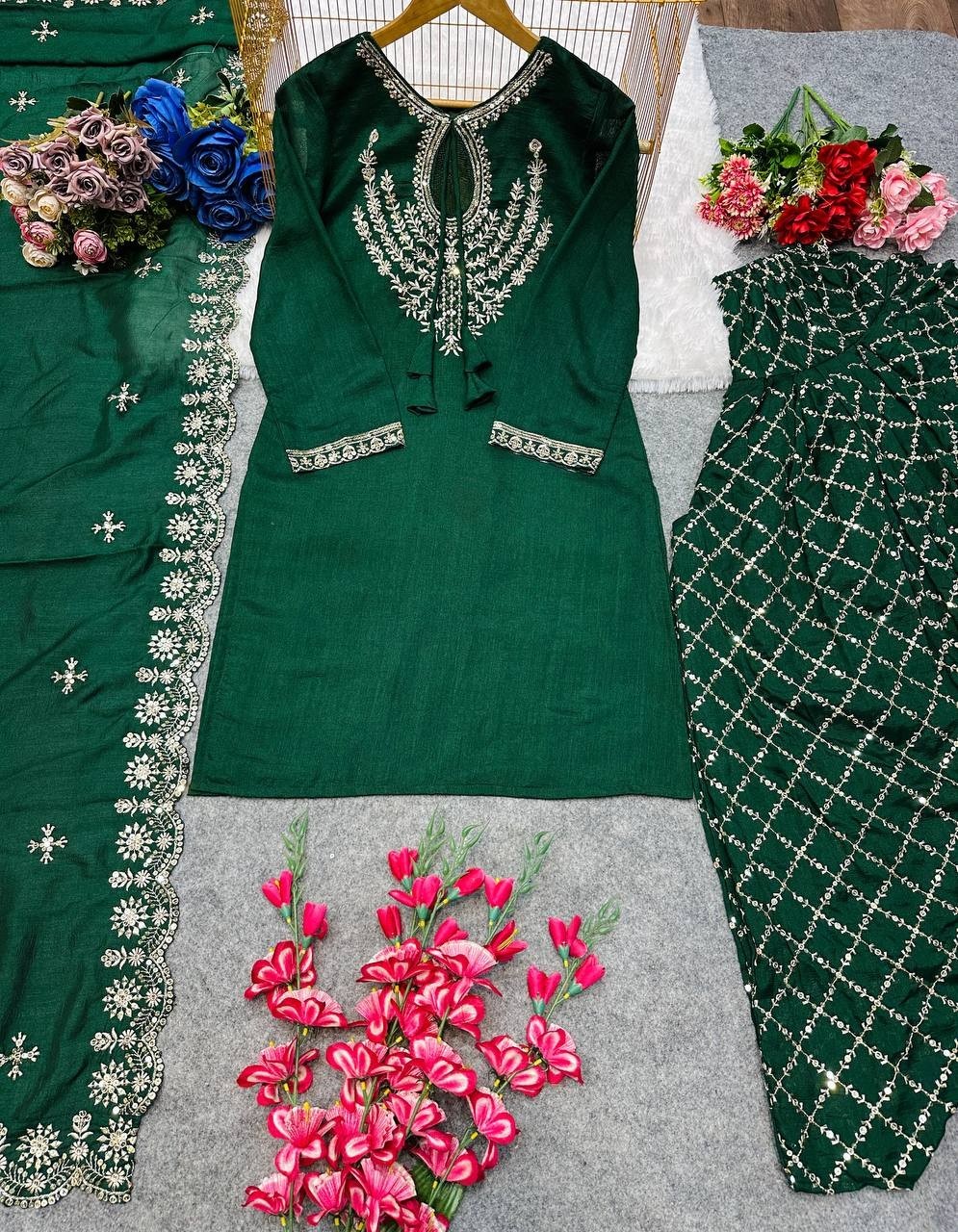New Launching Heavy Vichitra Silk Top Dhoti With Green Dupatta For Women Girls