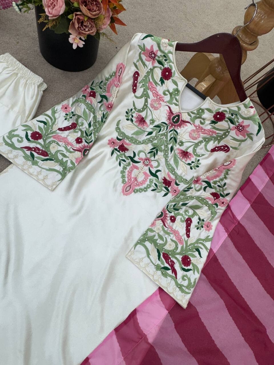 как выглядит New Style White Natural Crepe Silk Top Bottom With Dupatta For Festival Wear фото