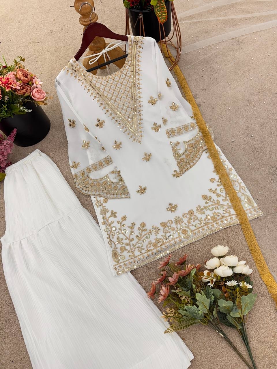 Beautiful Faux Georgette White Top Palazzo With Dupatta For Wedding Function