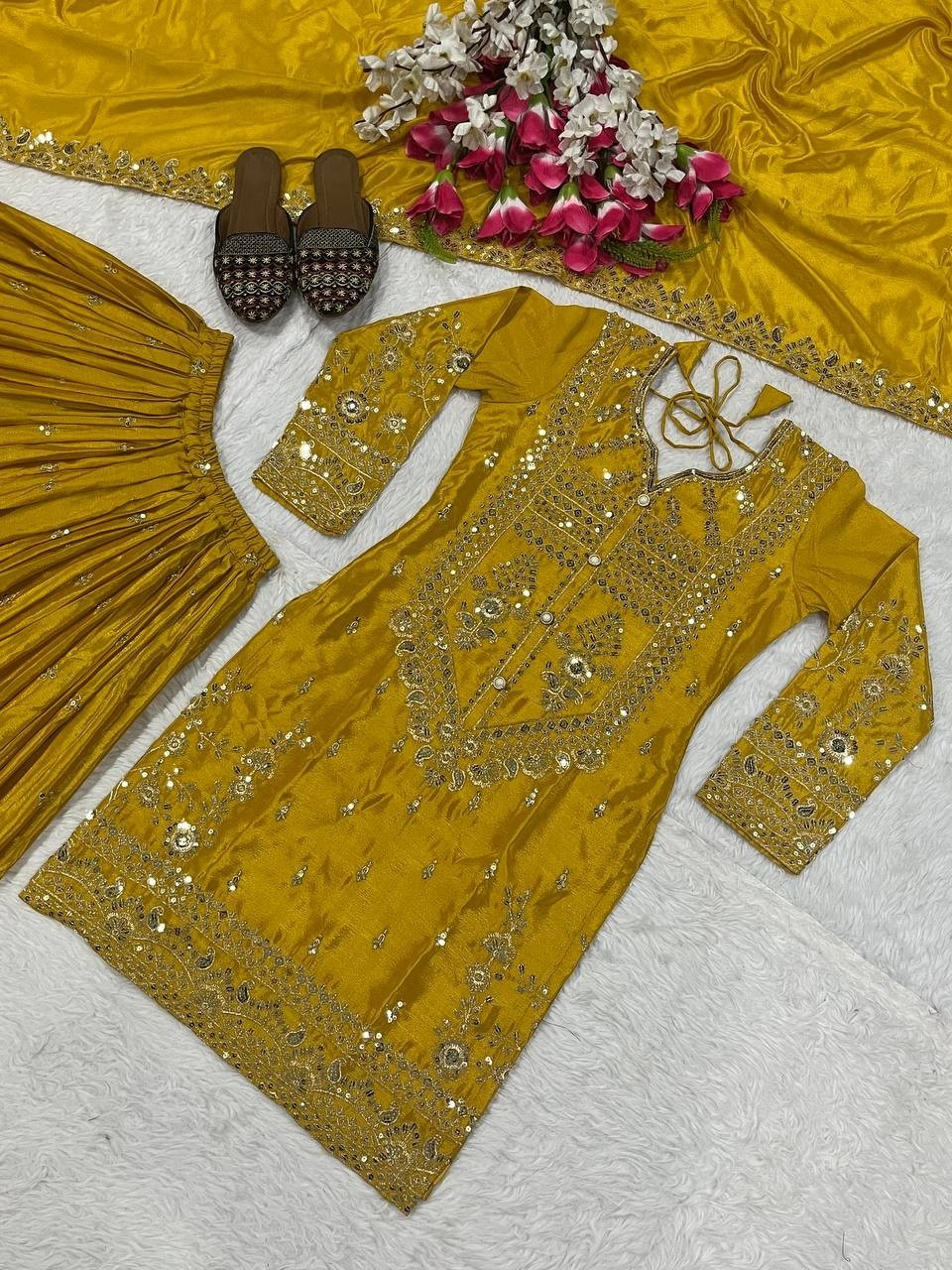 Attractive Heavy Chinnon Yellow Palazzo Suit And Dupatta For Women Wedding