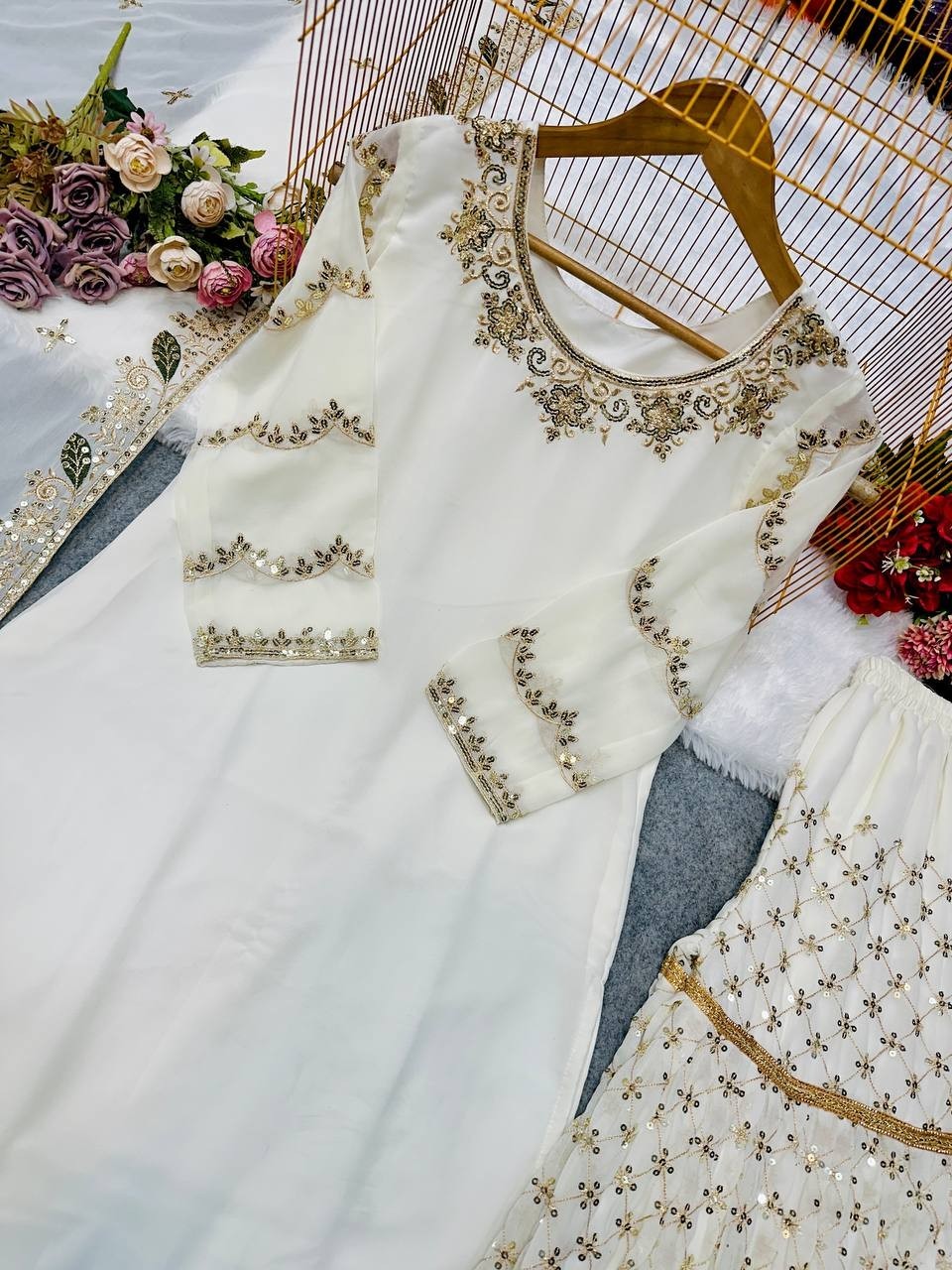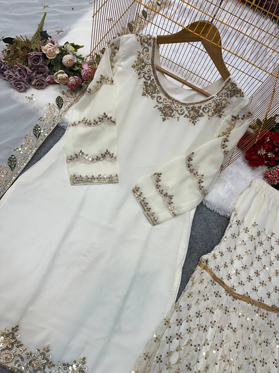 Indian Style White Heavy Georgette Top Palazzo With Dupatta For Reception Wear