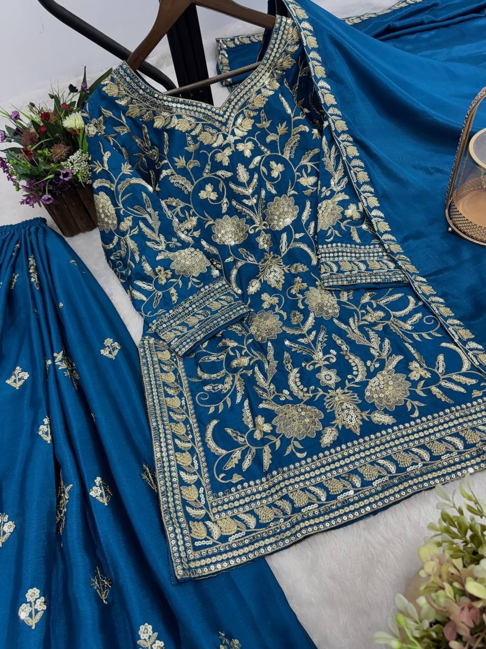 Classic Look Pure Chinnon Silk Palazzo Suit And Blue Dupatta For Reception Wear