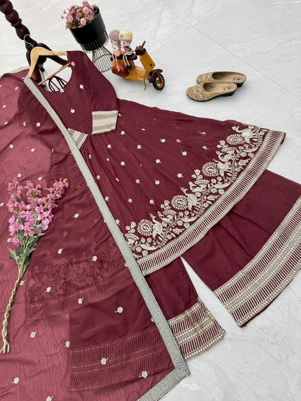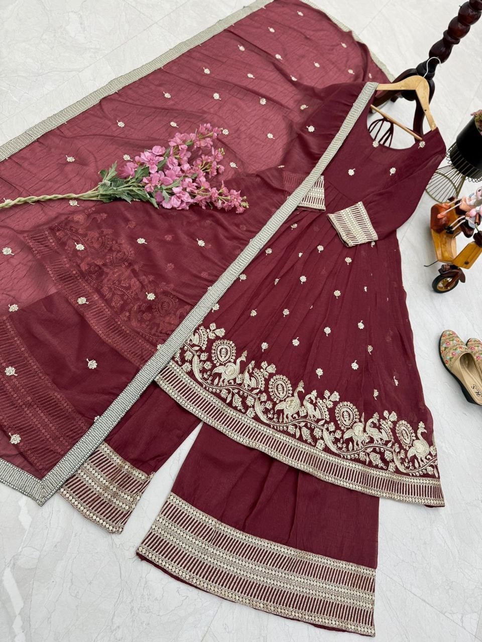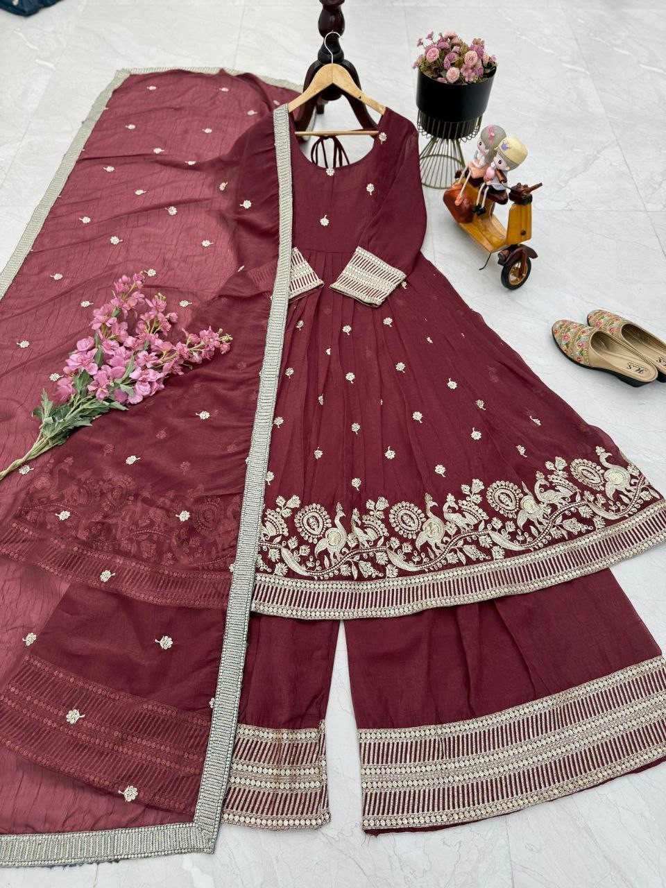 New Designer Maroon Gold Crazy Kurta Palazzo With Dupatta For Women Girls