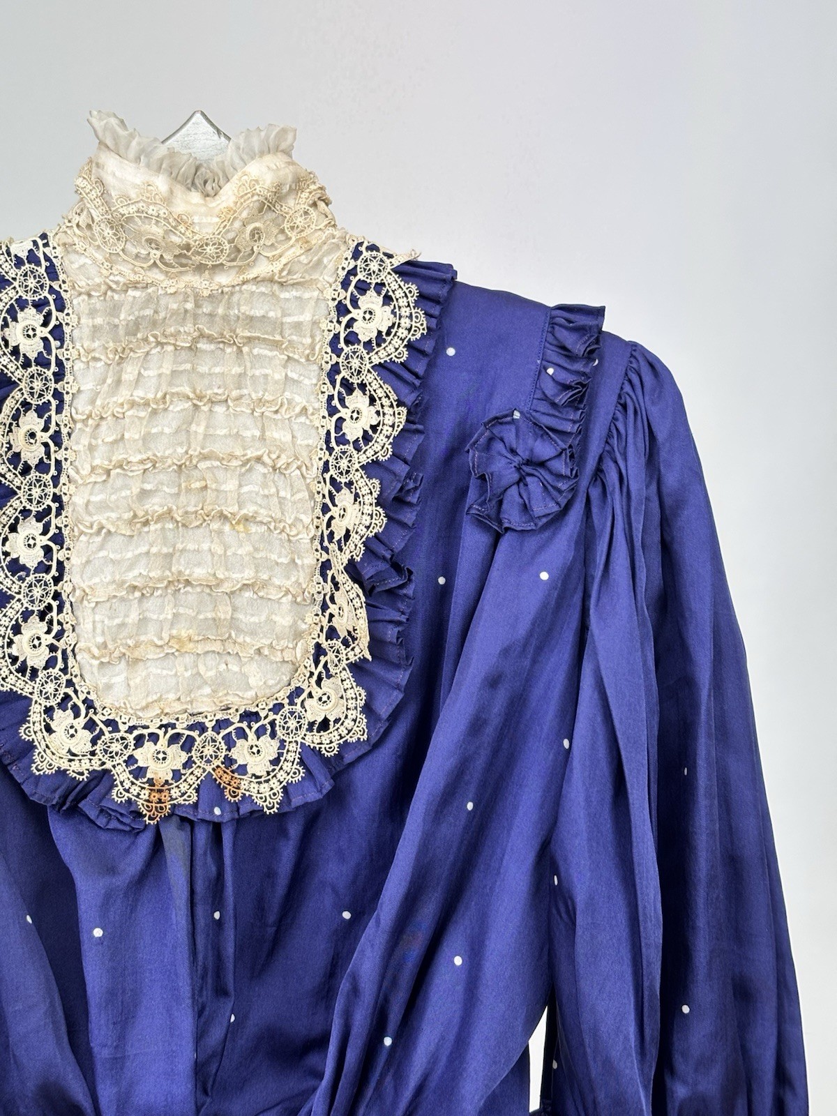 как выглядит Antique Victorian Silk Dark Blue Polka Dot Bodice Blouse Lace Trim Ruffles AS IS фото