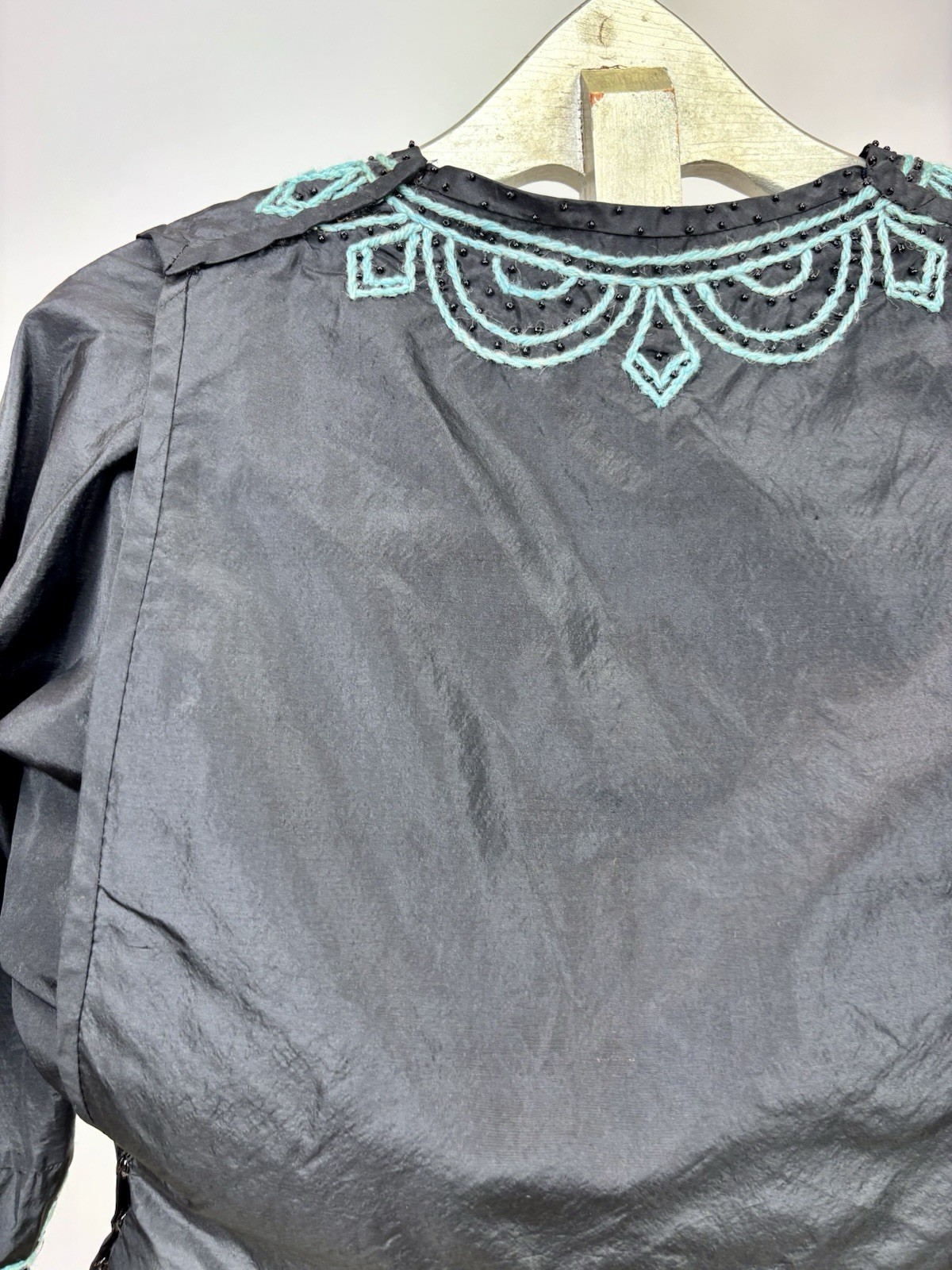 Antique Victorian Bodice Black Taffeta Black Beading Teal Blue Embroidery w Vest