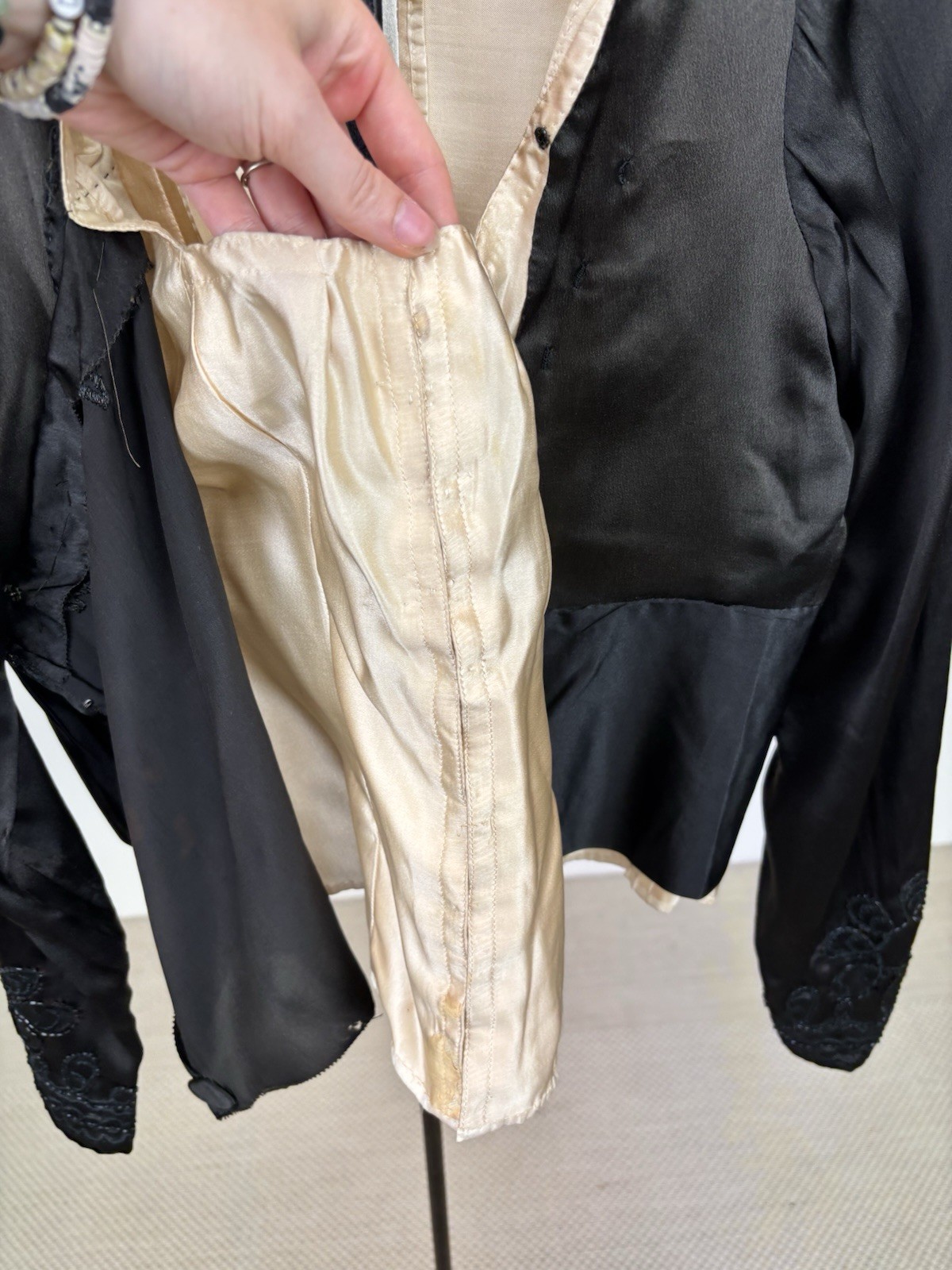 как выглядит Antique Victorian Bodice Black and Cream Satin with Black Embroidery and Beading фото