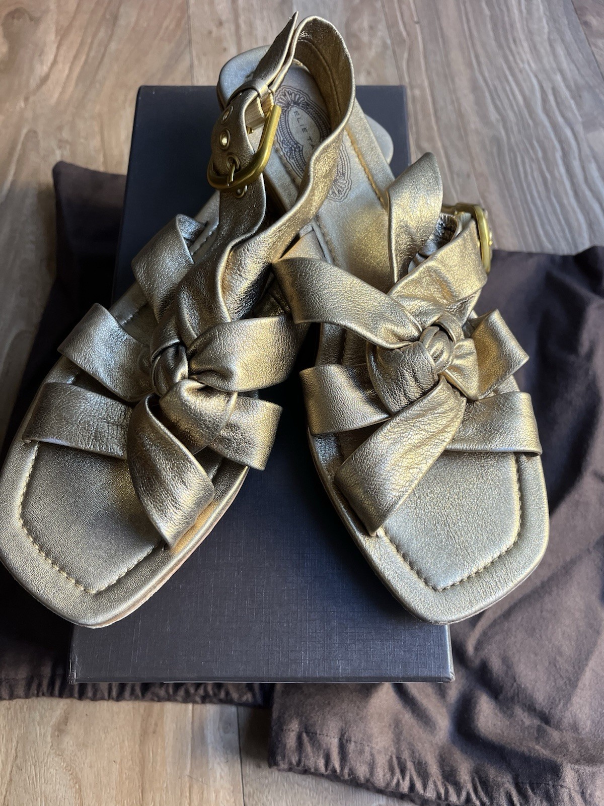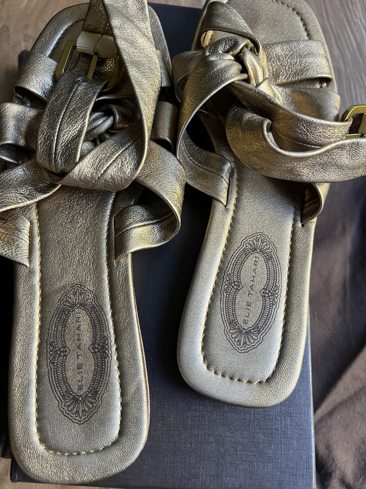 как выглядит Elie Tahari Womens Taupe Leather Open-Toe Sandals, Size 38/8 Color Gold фото