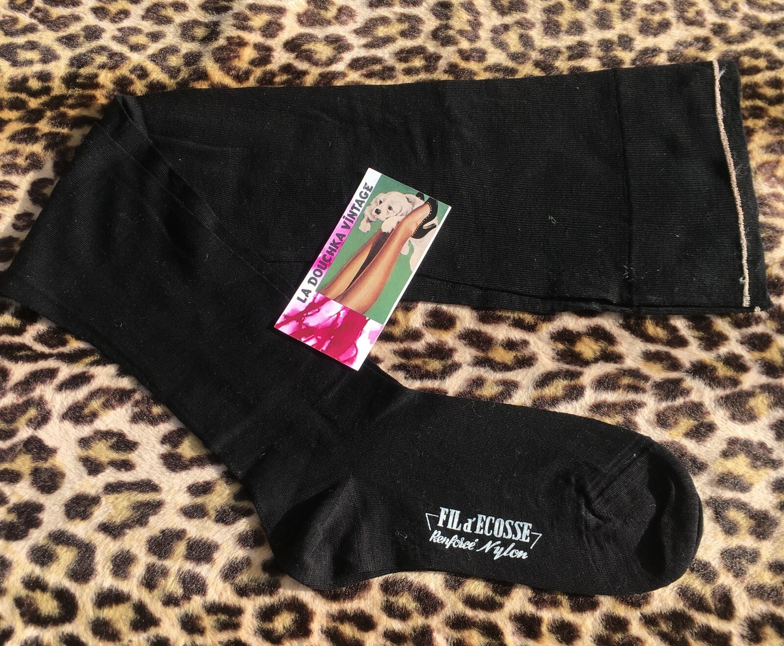 FRENCH 1920s WOMEN BLACK SEAM STOCKINGS SHEER MERCERISED KNIT COTTON UNWORN M/L