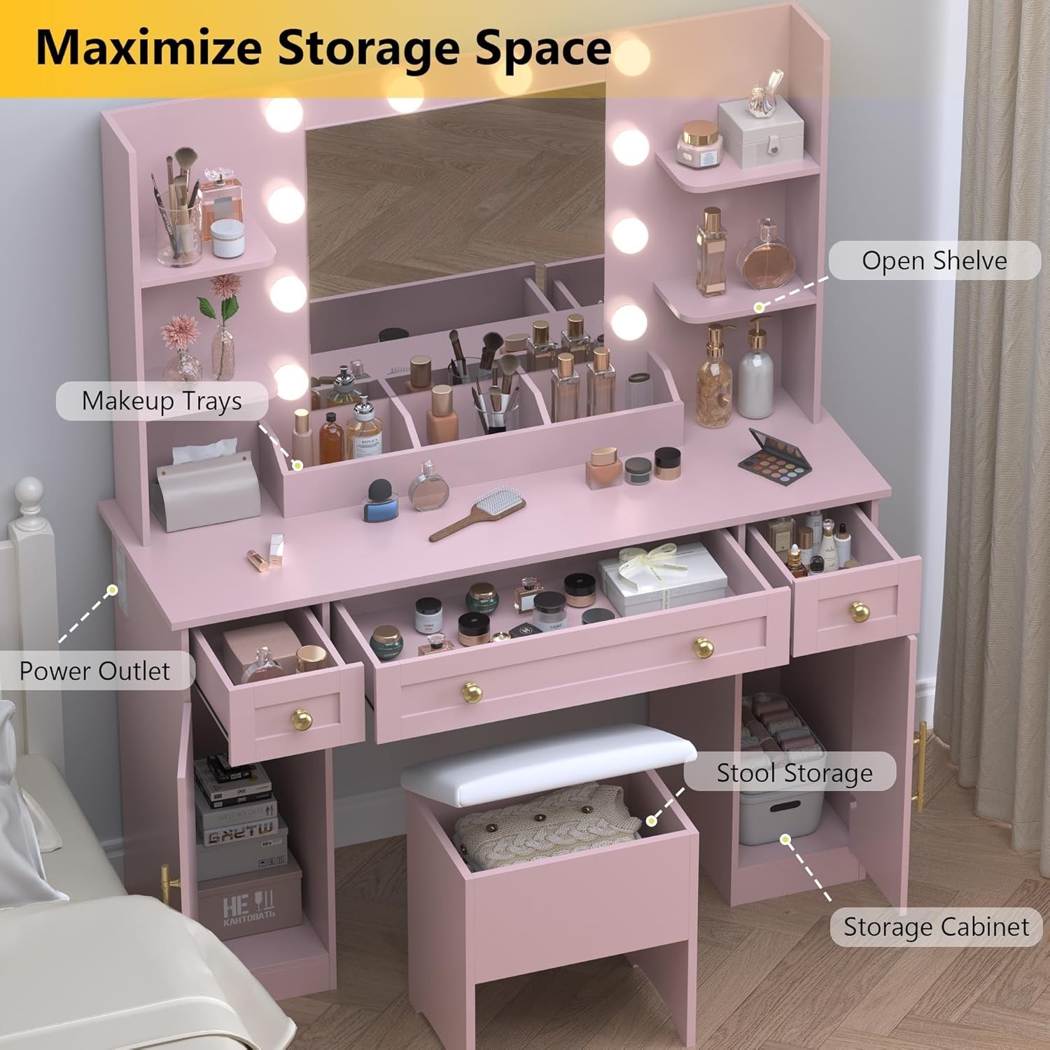 Makeup Vanity Set with Charging Station, Mirror Lights for Bedroom