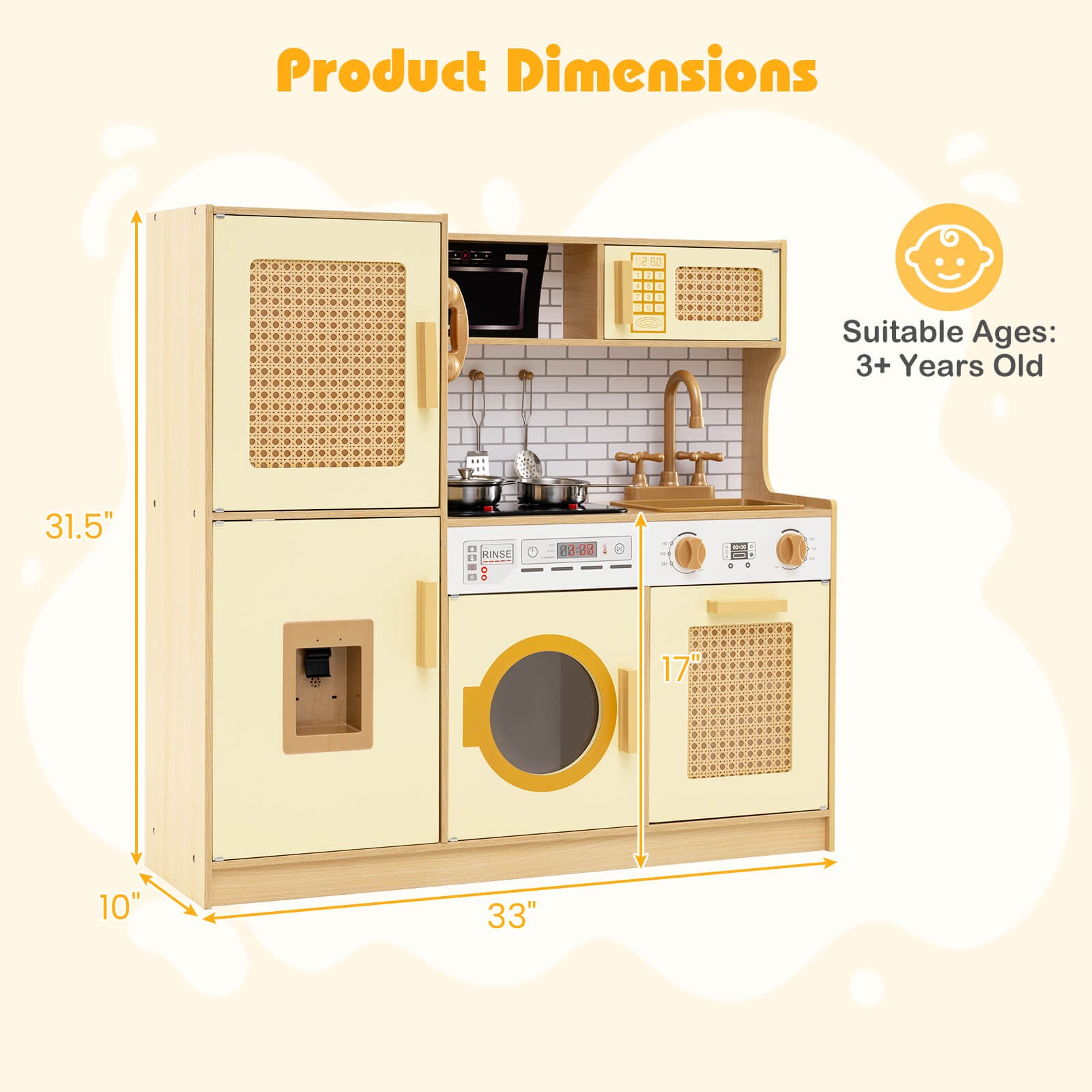 Set Includes: 1 × Wooden Play Kitchen, 1 × Pan, 1 × Pot with Lid, 1 × Spoon, 1