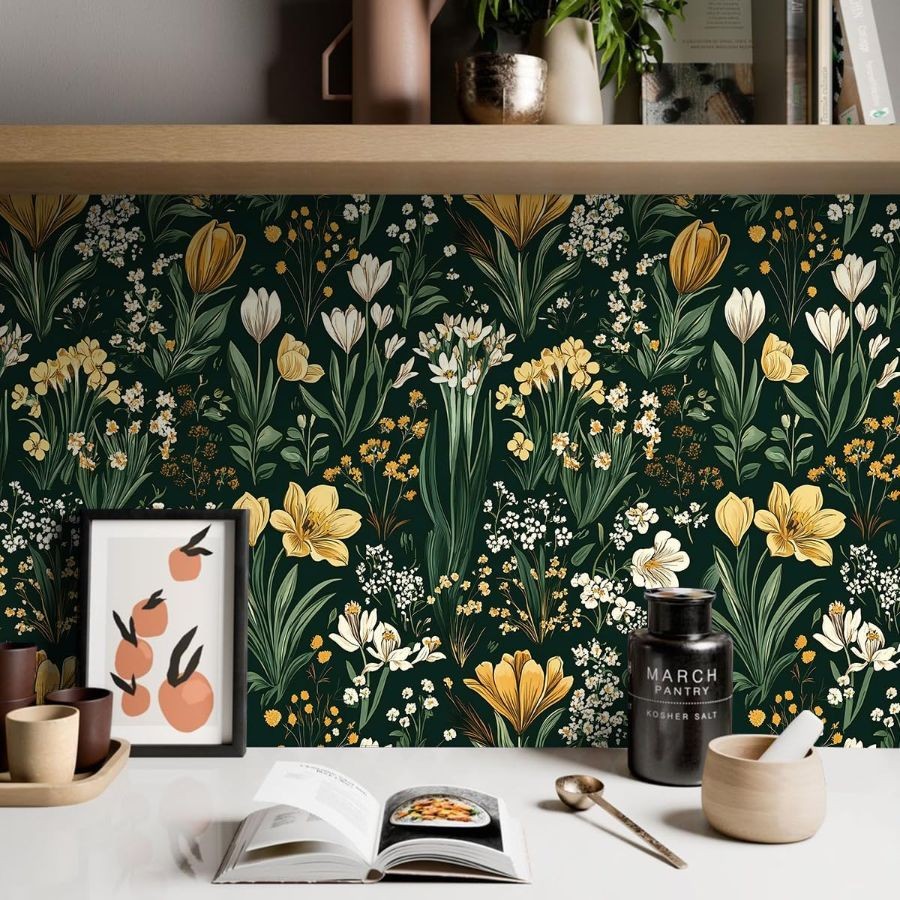 как выглядит Green Floral Peel and Stick Wallpaper 16.9in x 118.1in Vintage Floral Contact фото