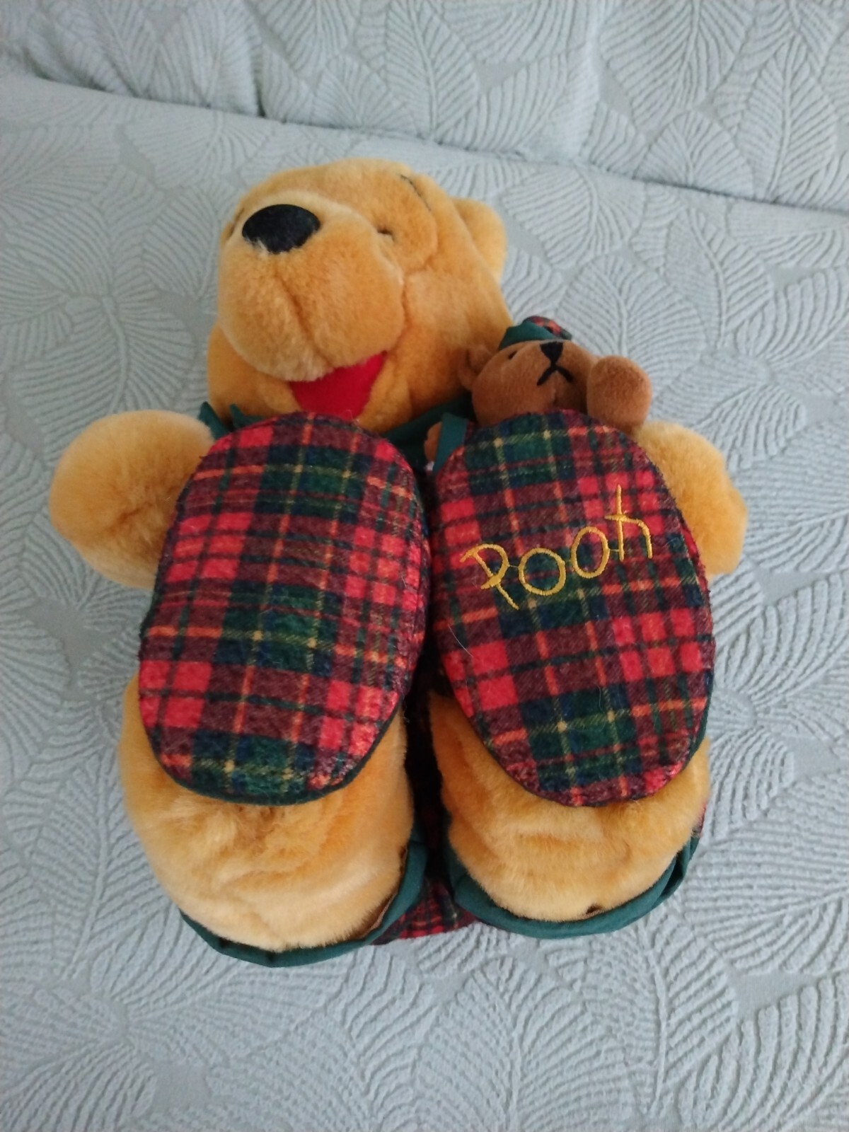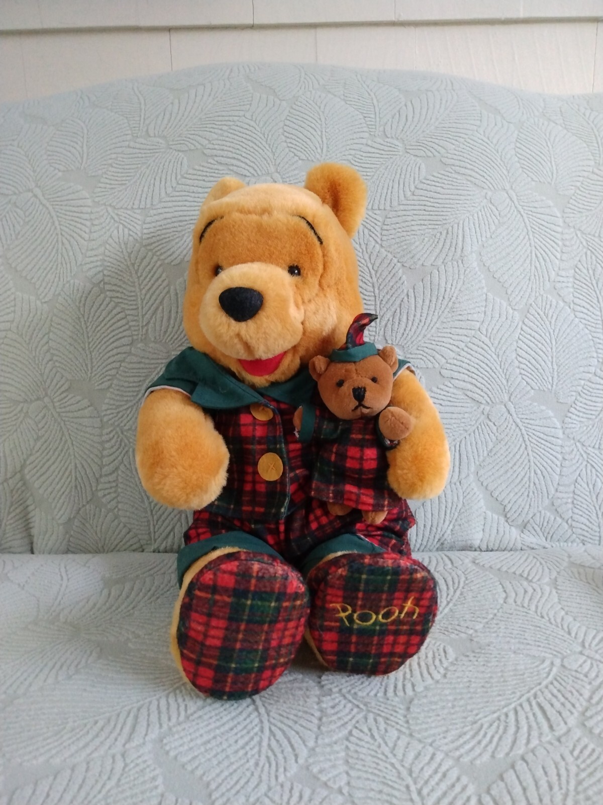 как выглядит VTG Winnie the Pooh Holding Toy Bear Plush Plaid PJs Slippers 16" Disney фото