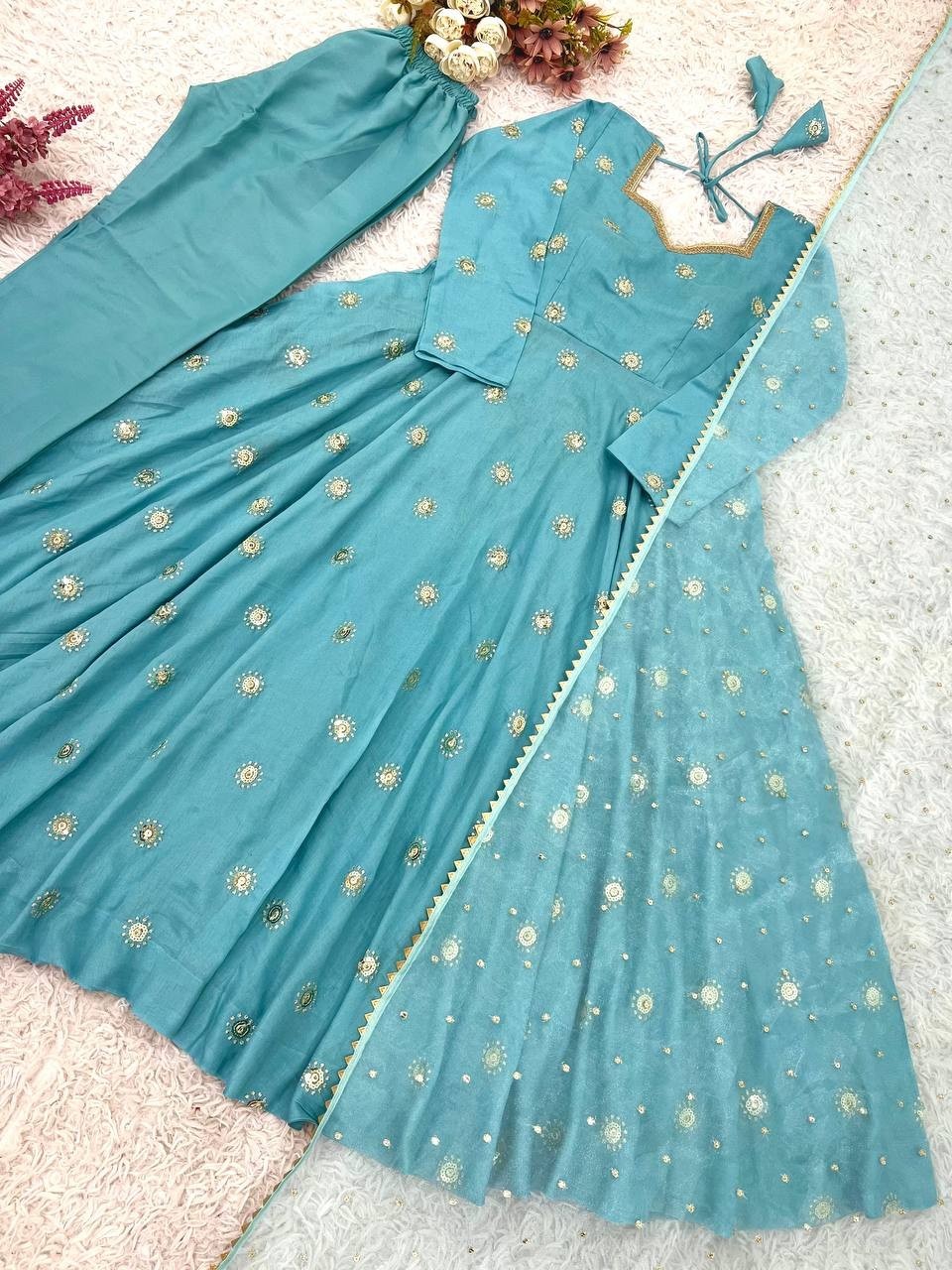 как выглядит Stylish Heavy Vichitra Silk Sky Blue Gown Bottom With Dupatta For Indian Party фото