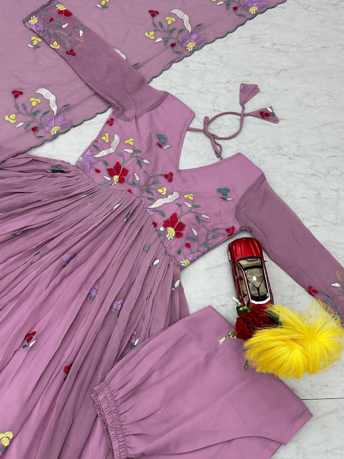 как выглядит Stylish Faux Georgette Gown Bottom With Lavender Dupatta For Festival Wear фото