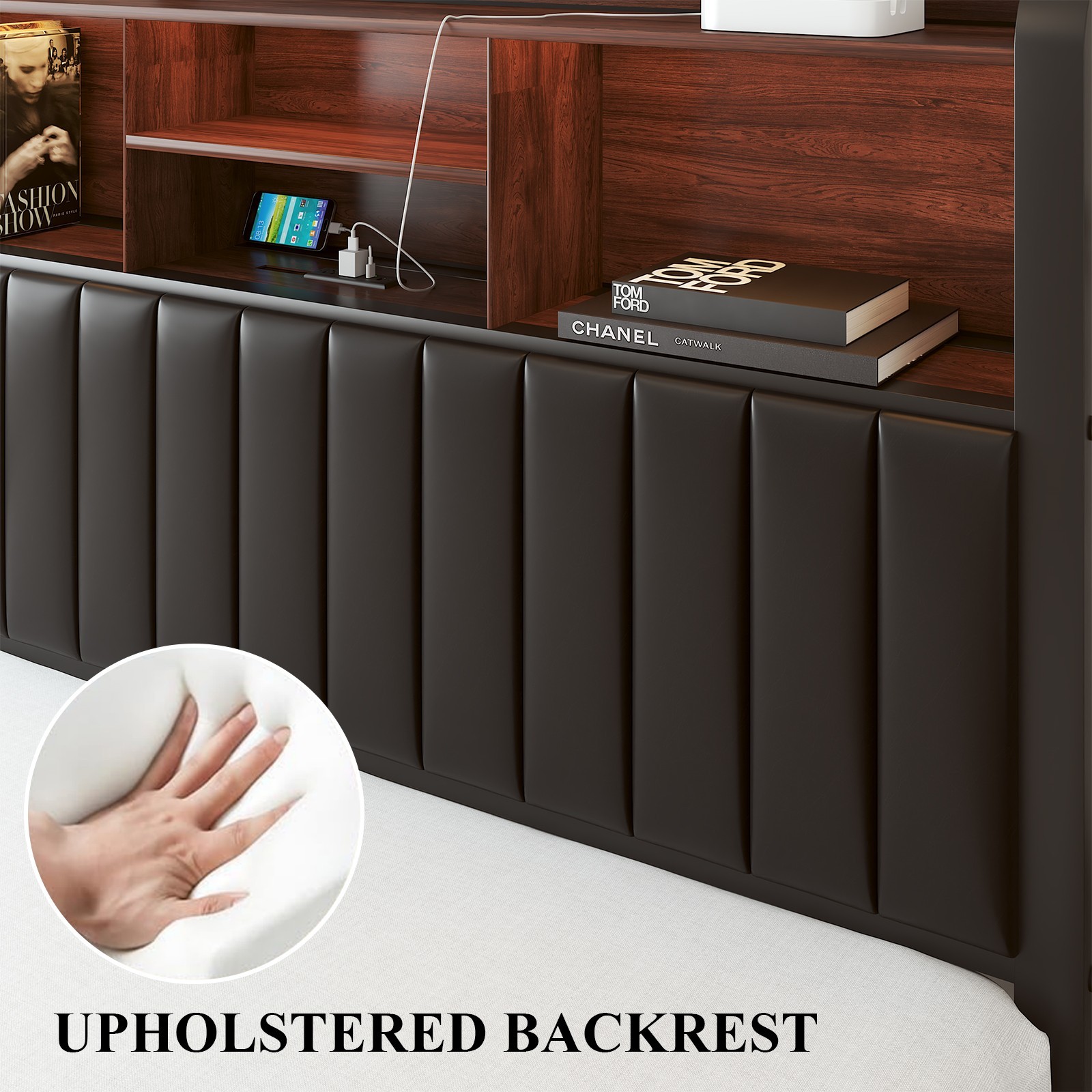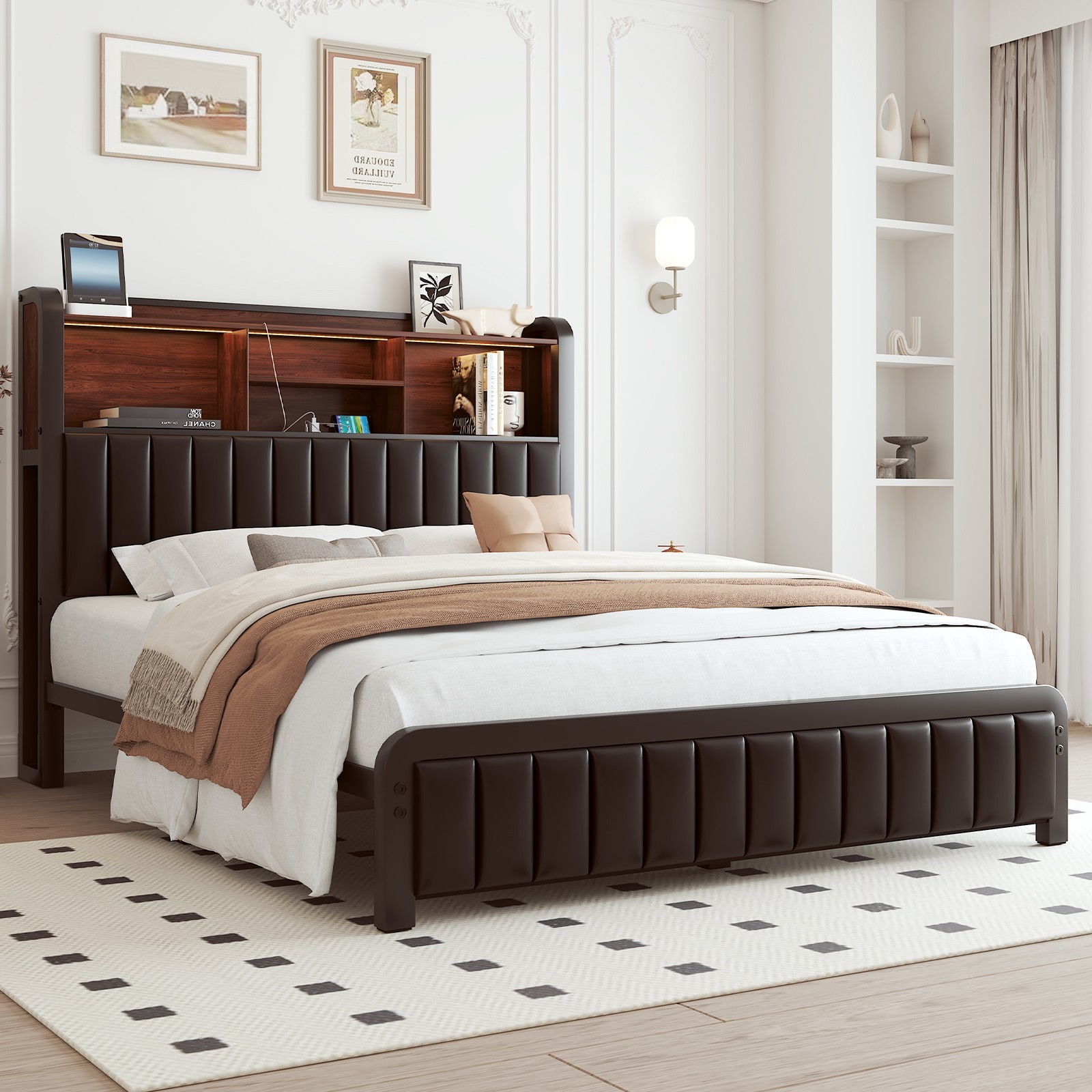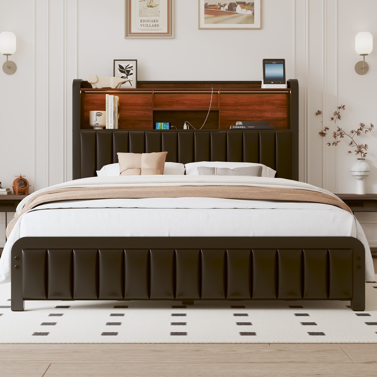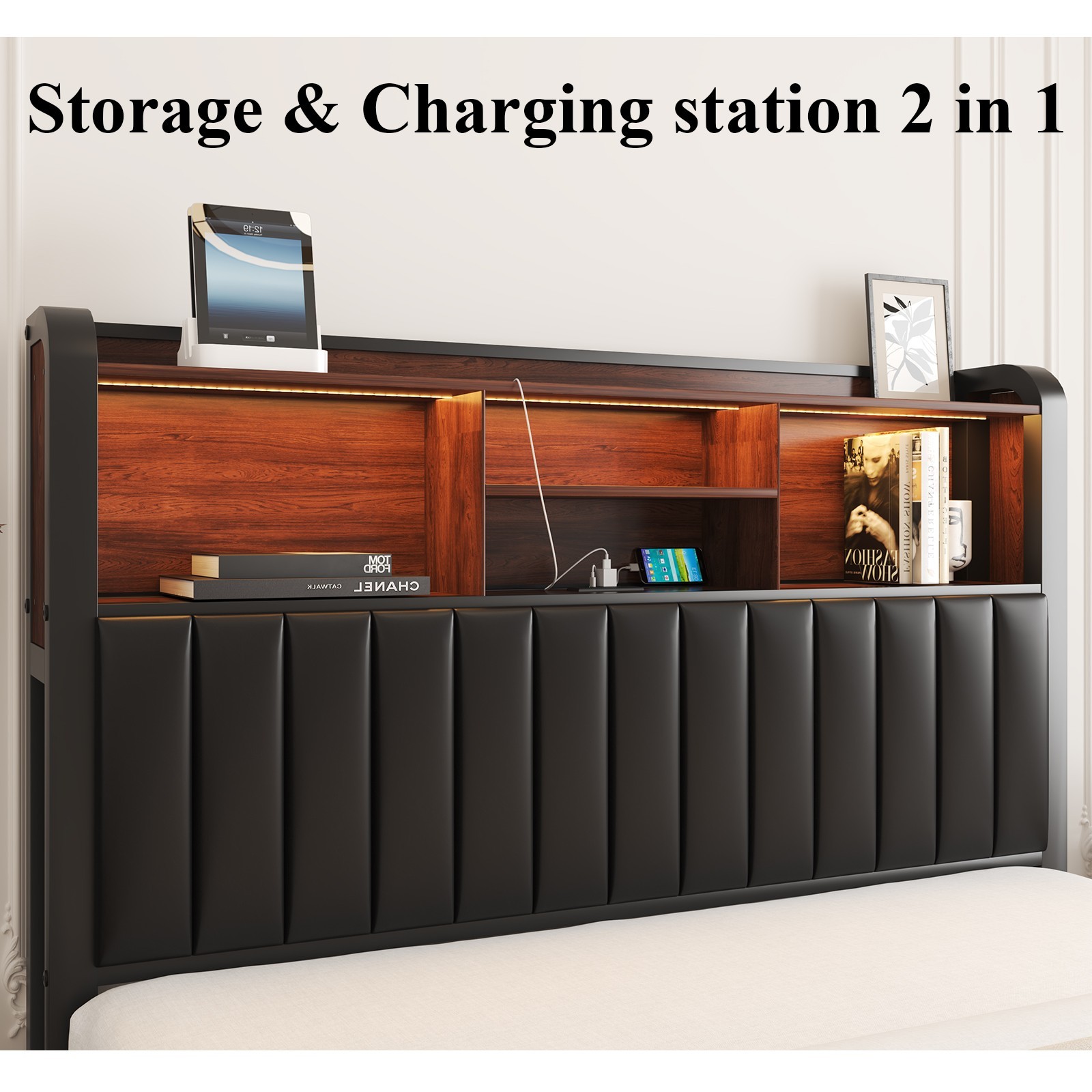 Full Queen Size Metal Bed Frame with LED and Storage Charging Headboard