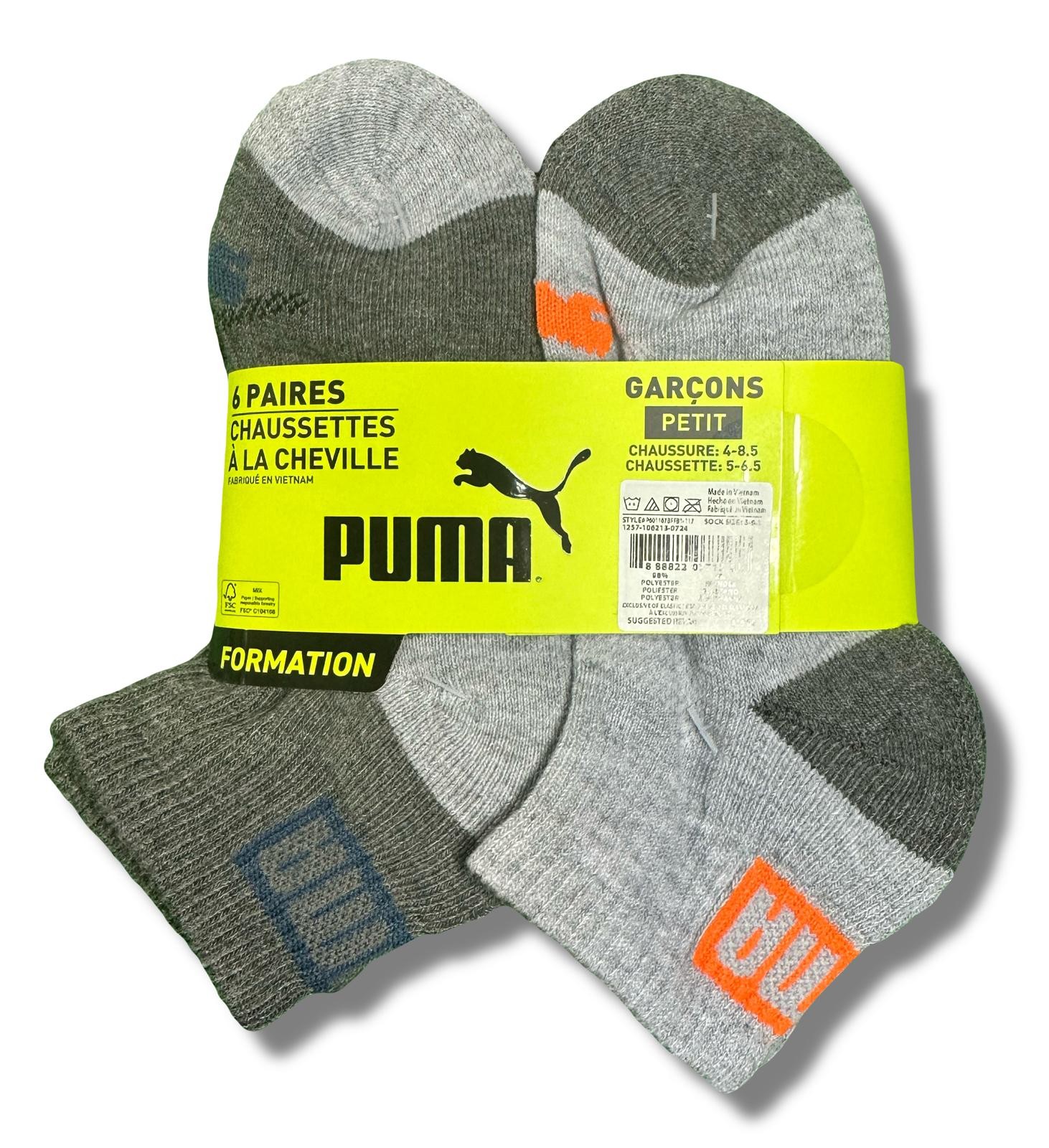 PUMA SOCKS BOYS X6 - QUARTER 253 - ZING GREY ORG - SMALL SHOE 4-8.5 - 6 PACK