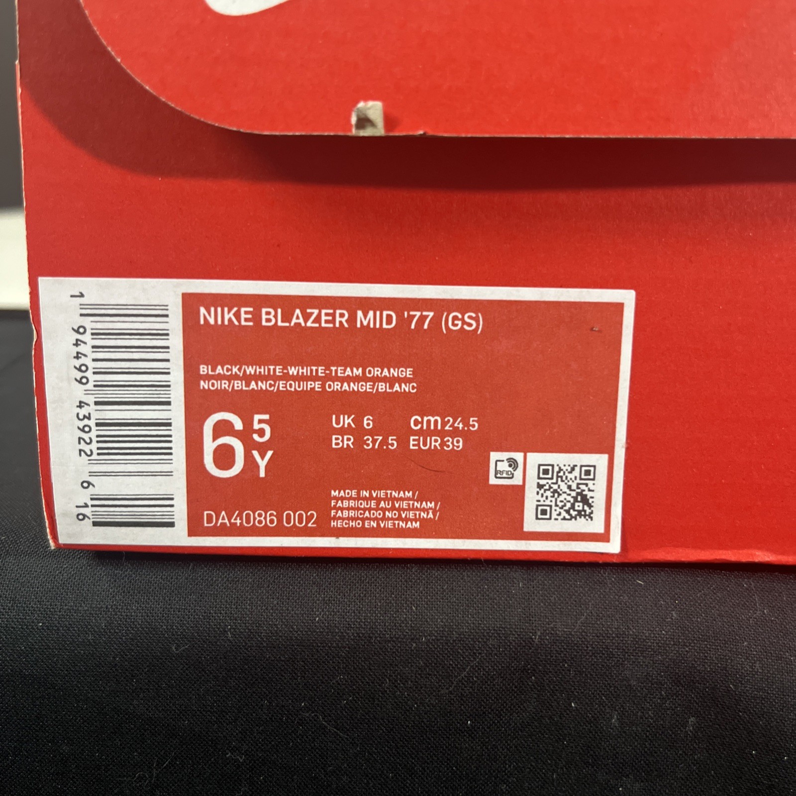 как выглядит M 6.5Y Nike Blazer Mid 77 GS Black/White-White-Team Orange DA4086-002 фото